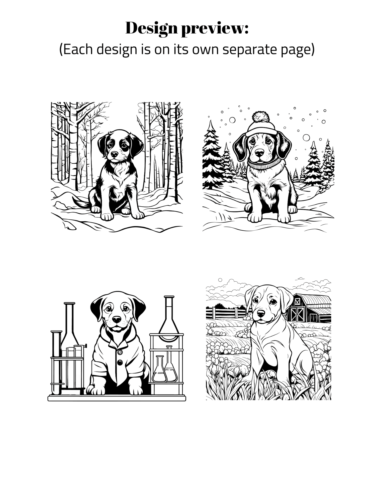 "Doggy Doodles Delight" is a quirky and joyful coloring book great for young artists and dog lovers alike! This coloring book offers hours of creative pleasure for kids with 20 lovely pages of charming canine pictures. Each page features adorable puppies in various playful poses. It's a fun coloring book for youngsters of all ages simply because the drawings are carefully created to convey the endearing essence of our furry friends.