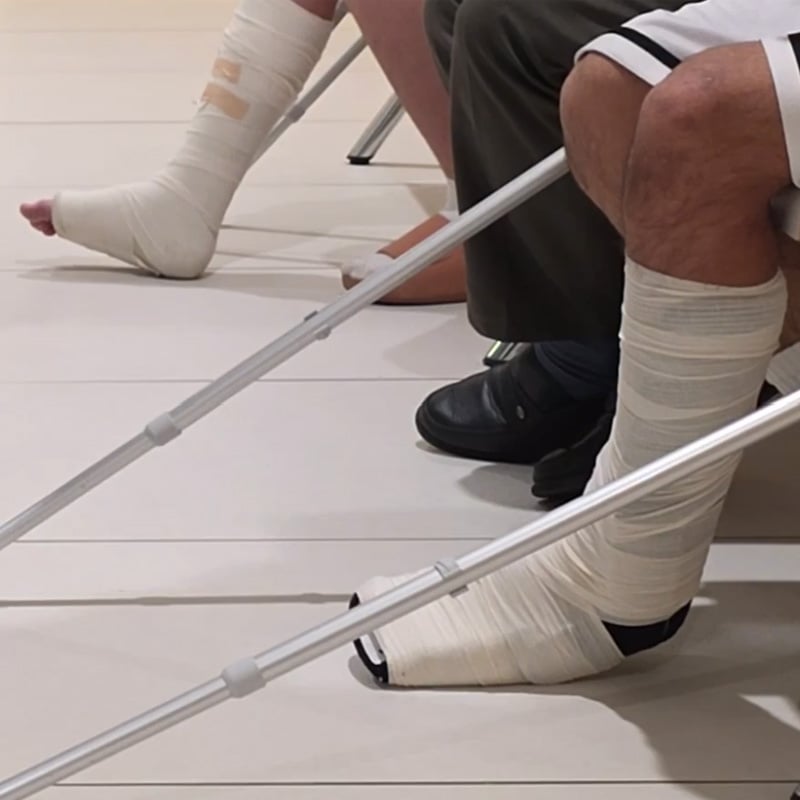 Boy #1 arrives at the hospital in a split SLC with free toes. Directly behind him is Boy #2 with a temporary SLC splint. They take the elevator one after the other, and we admire them both on their crutches for a moment.