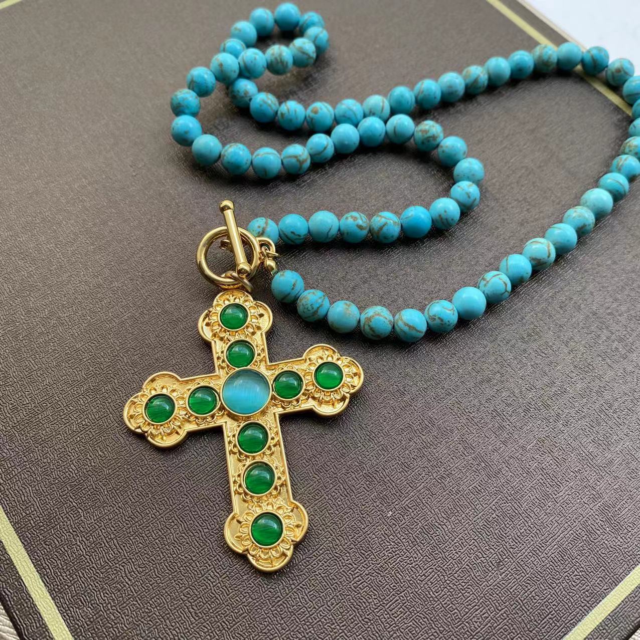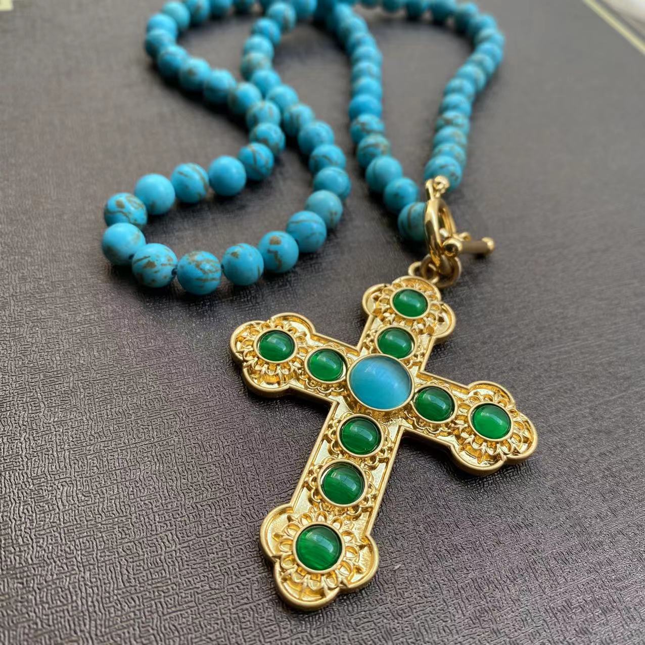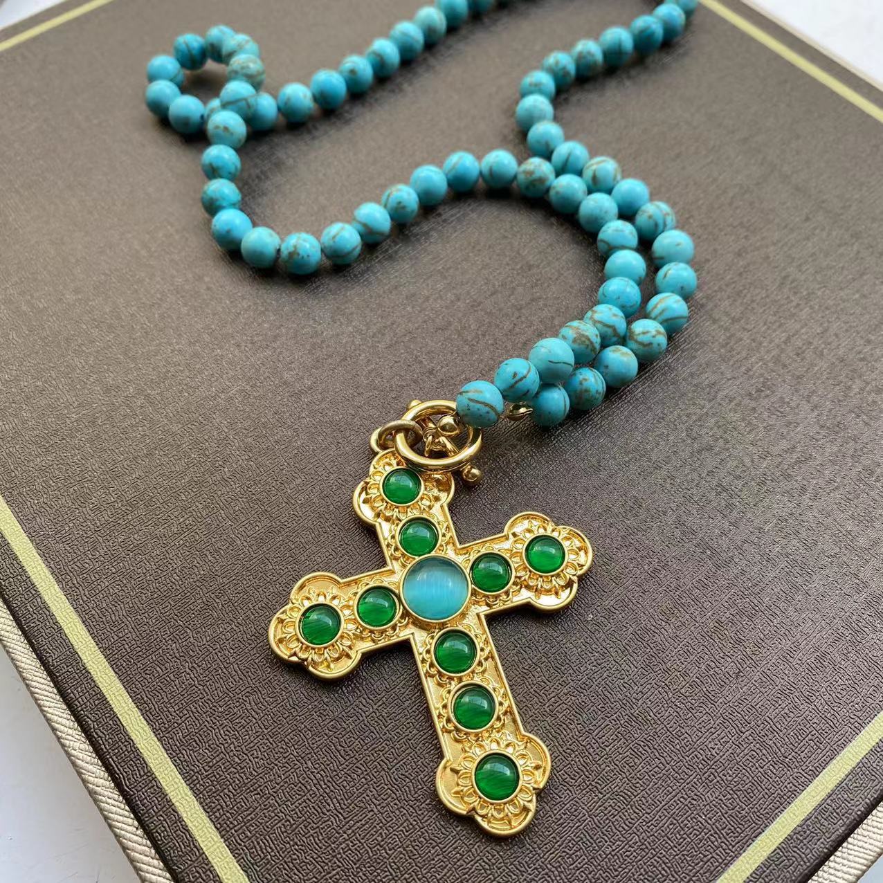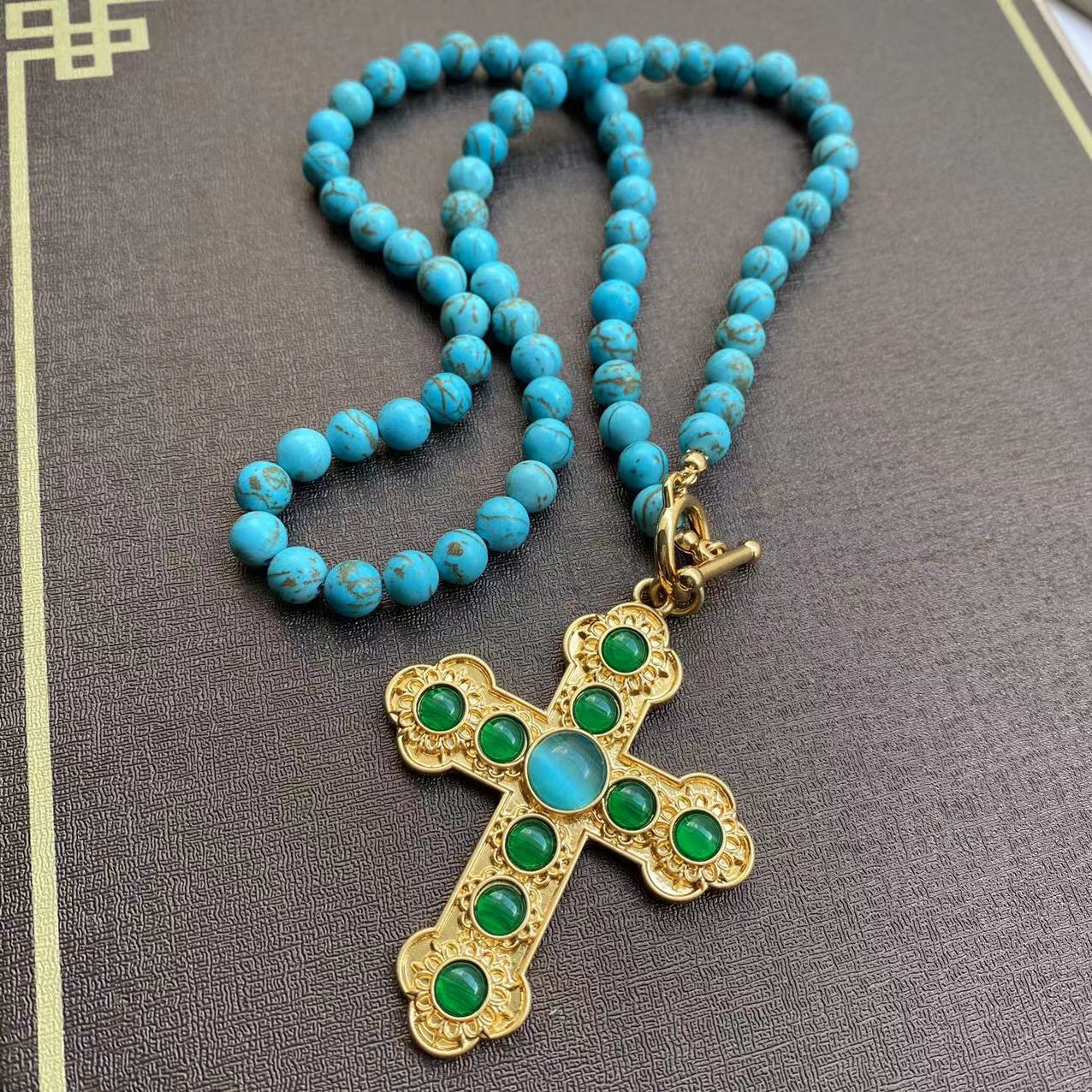 Vintage medieval ethnic style blue turquoise beaded cross pendant necklace