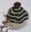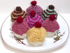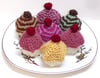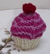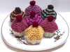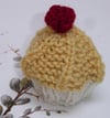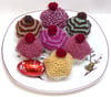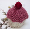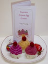 Cute Cupcake Creme Egg Cosies that conceal a creme or similar sized chocolate egg. Perfect for Easter fundraising events.The pattern provides instructions for knitting flat and seaming and for knitting in the round.