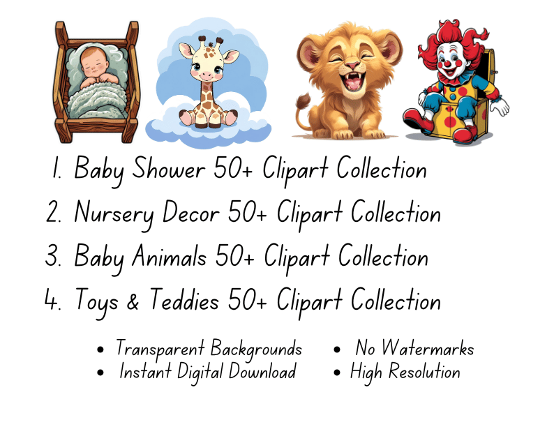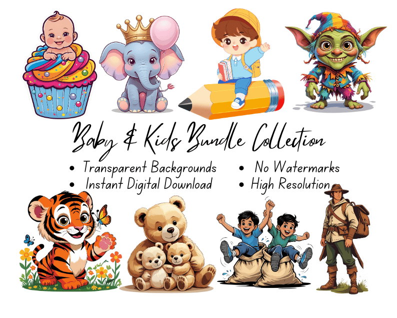 Bring joy, imagination, and cuteness to your creative projects with our Baby & Kids Bundle Collection! This beautifully curated bundle includes 10 themed clipart packs, each with 50+ high-resolution elements, perfect for baby showers, nursery wall art, kids’ party invitations, learning materials, scrapbooking, and more!