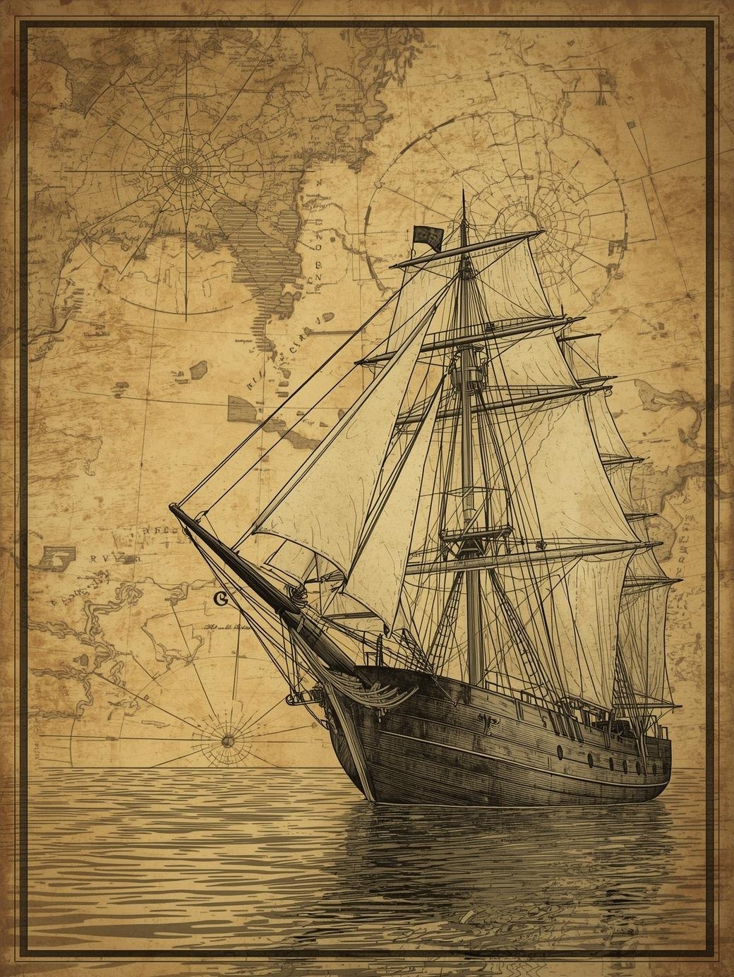 A majestic sailing ship cutting through open waters, set against an antique world map, captures the spirit of adventure, freedom, and timeless discovery.
