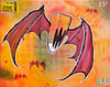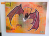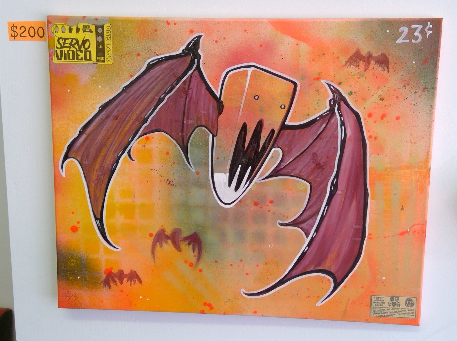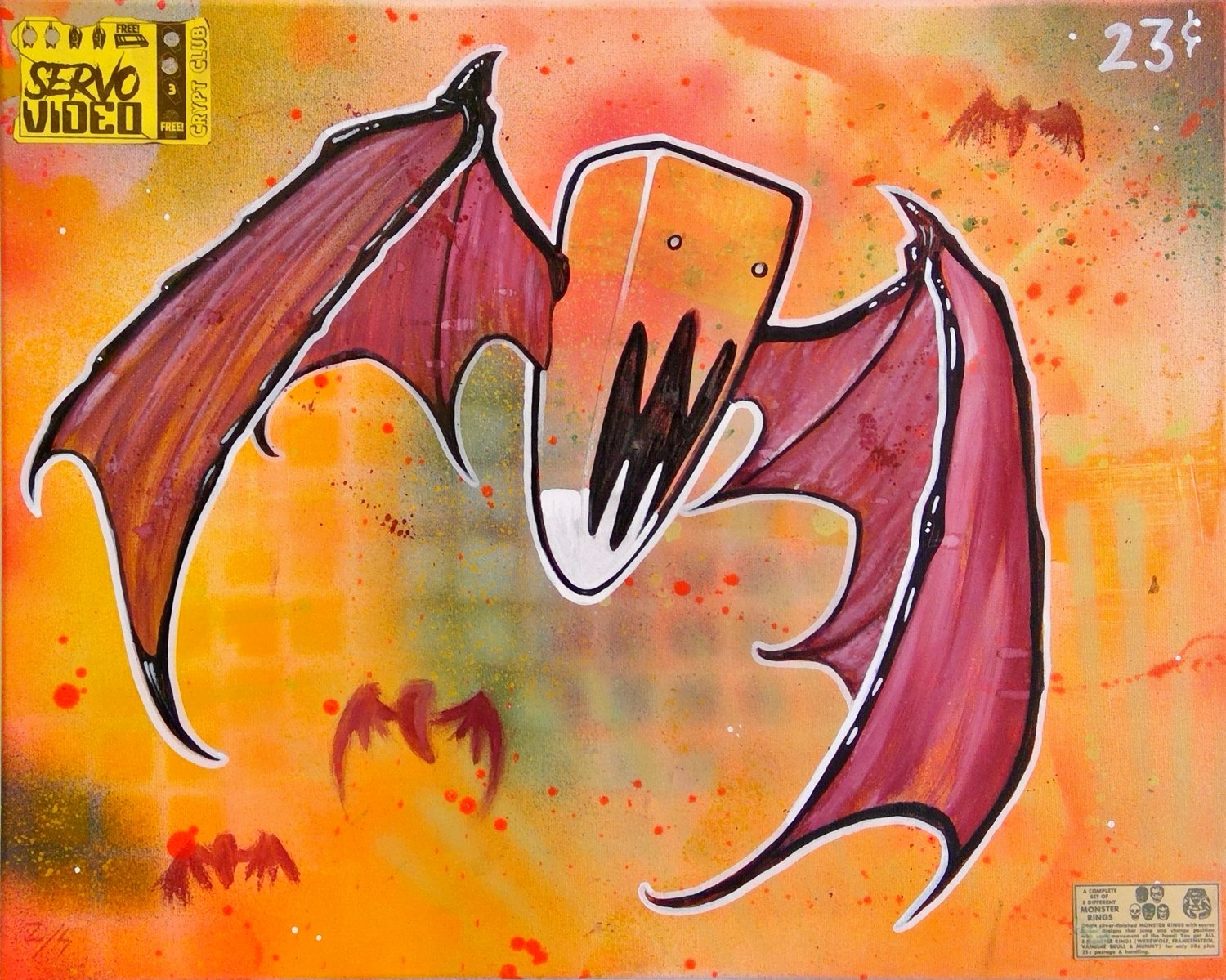 Over the years, I have done several variations of my candy corn bat. This is one of the more aggressive versions. There's a bit of mixed media in this one. The background is spray paint, while the foreground is watercolor and a little acrylic. I also attached a SERVO VIDEO free popcorn / rental. It measures 16" x 20"