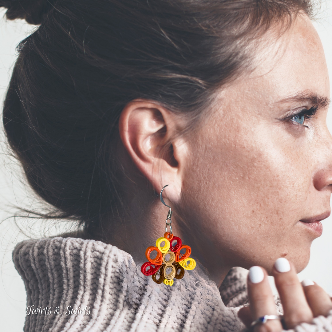 This quirky turkey earring is a fun burst of color! With vibrant quilled feathers in fiery reds, sunny yellows, and rich oranges, it’s a playful accessory. Lightweight and lively, it’s perfect for adding a splash of whimsy to any outfit!