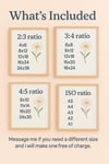 • 3:4 ratio: 6x8, 9x12, 12x16, 15x20, 18x24 inches