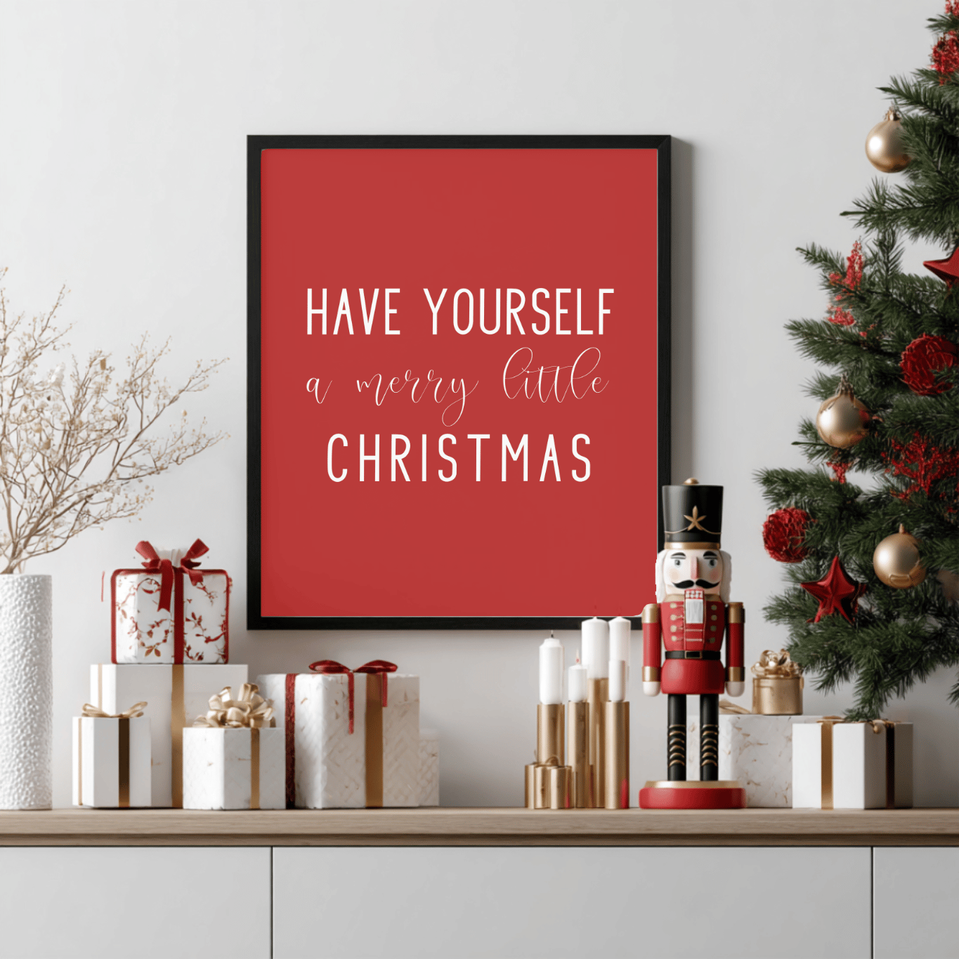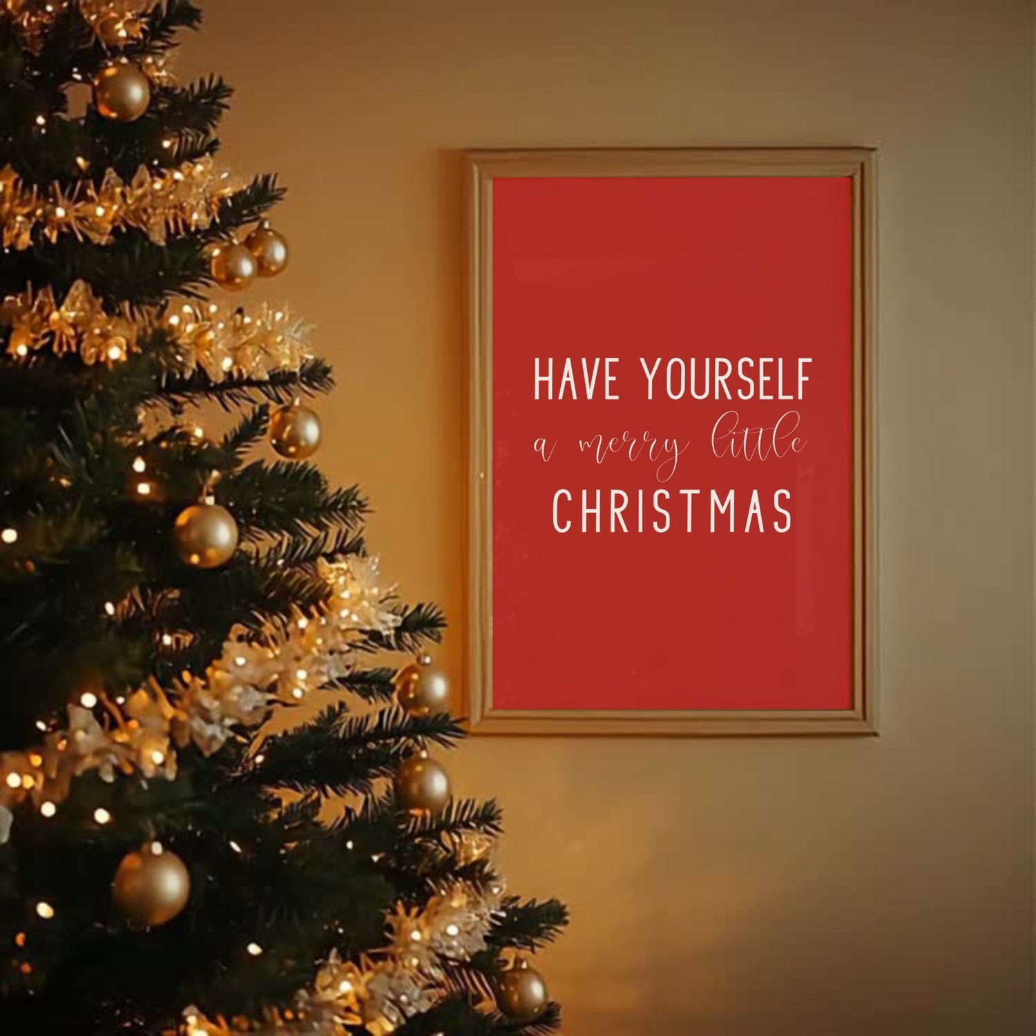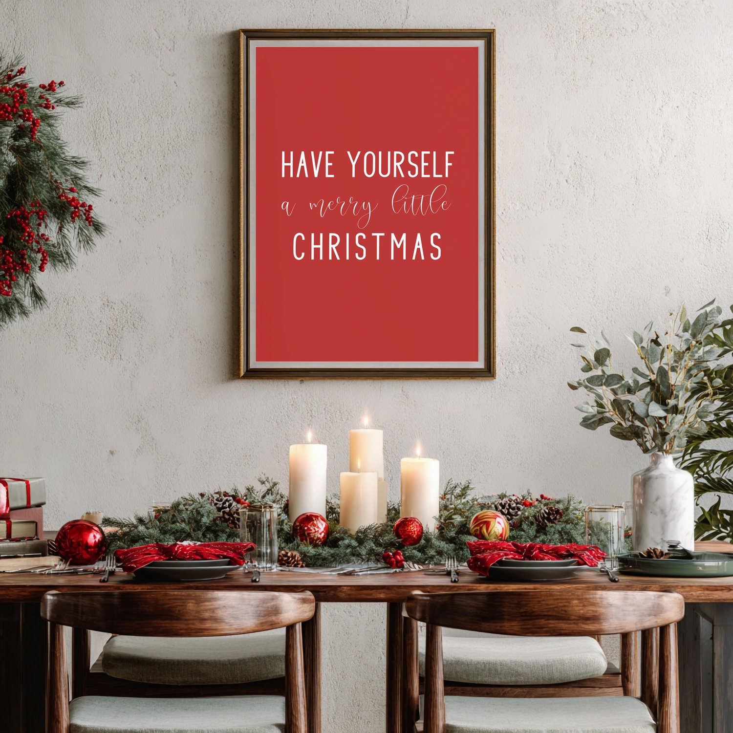 Add timeless charm to your home this holiday season with this “Have Yourself a Merry Little Christmas” printable wall art. Featuring elegant white lettering on a festive red background, this design brings warmth and cheer to any space — perfect for your living room, entryway, or mantel.