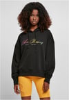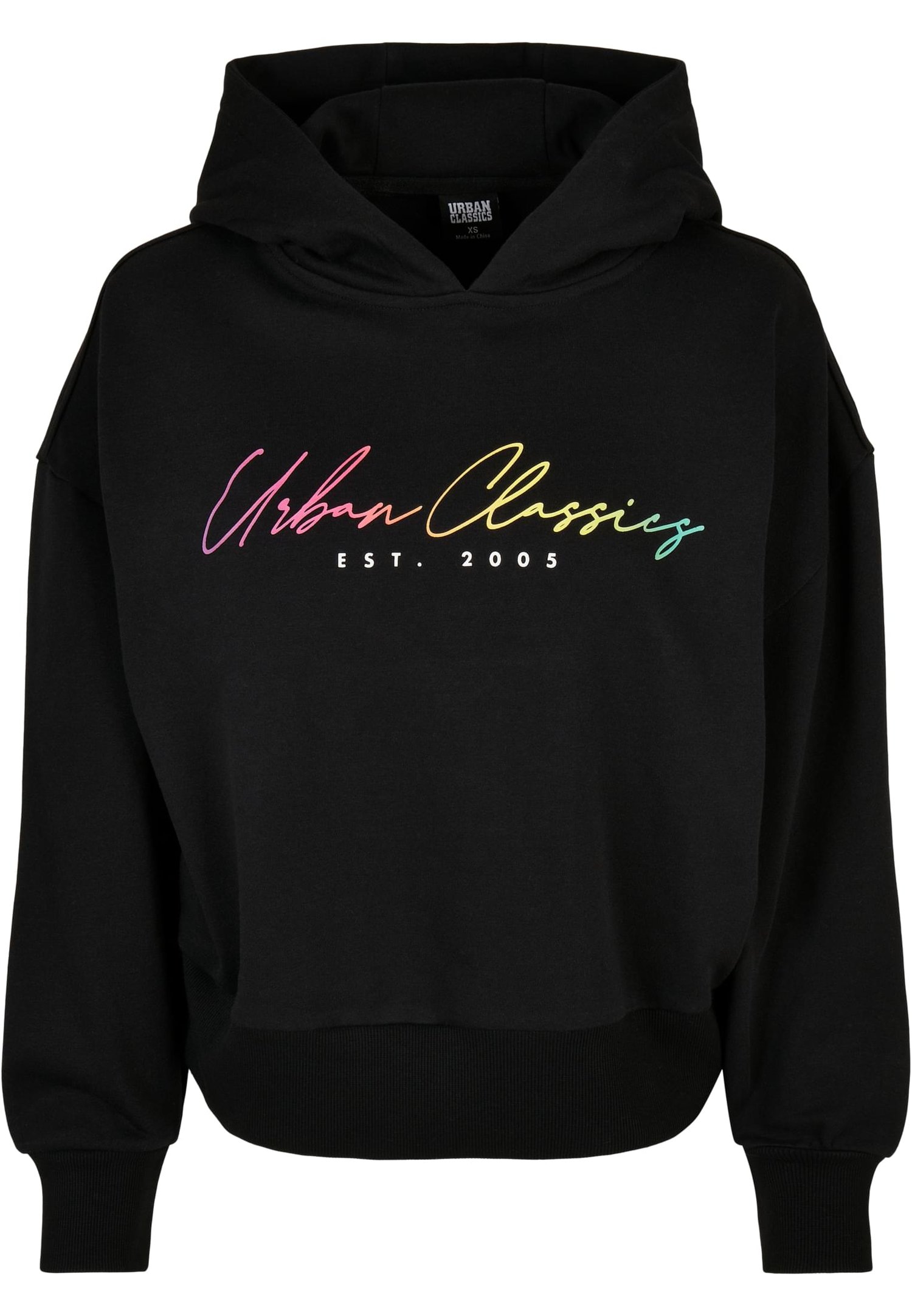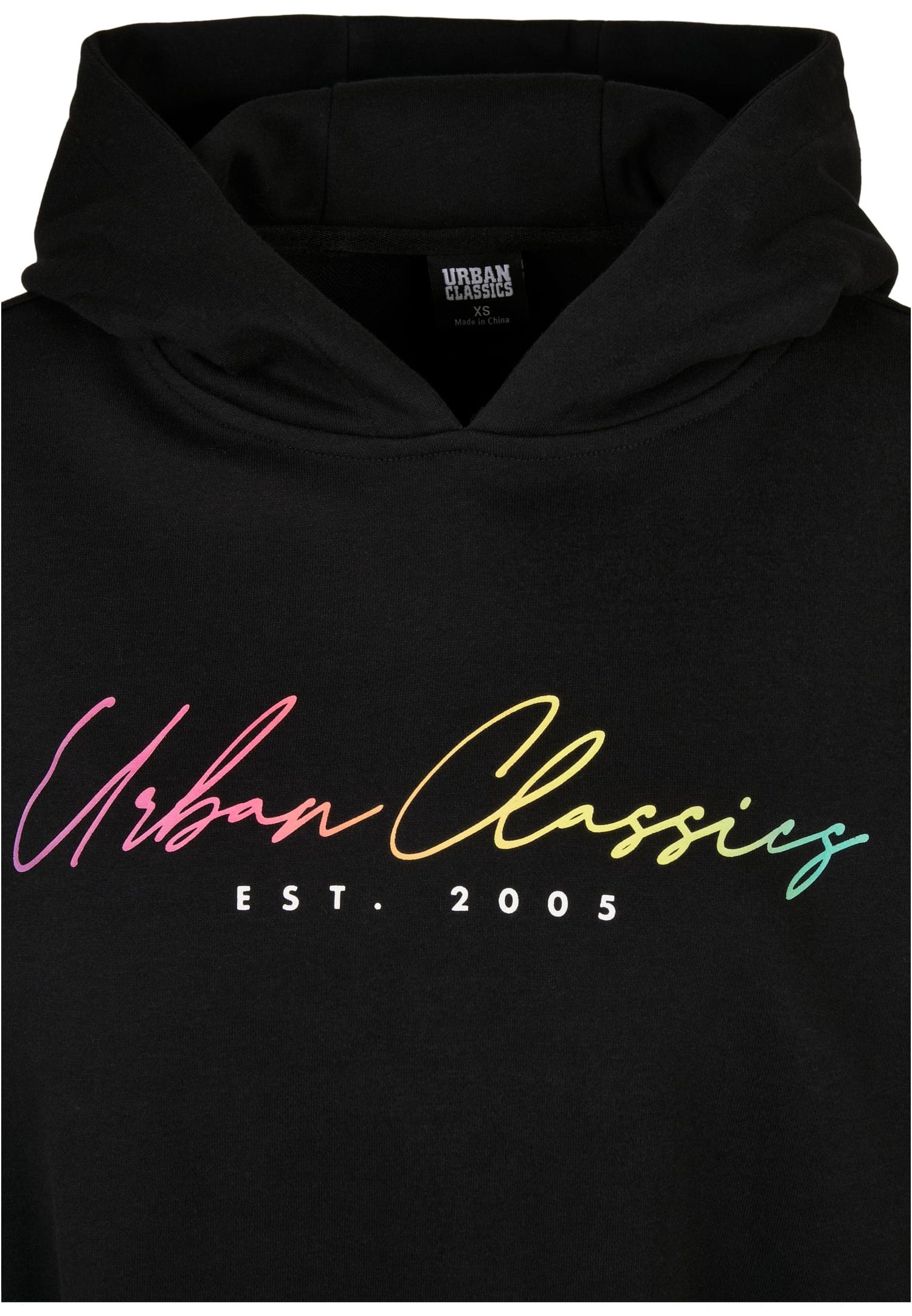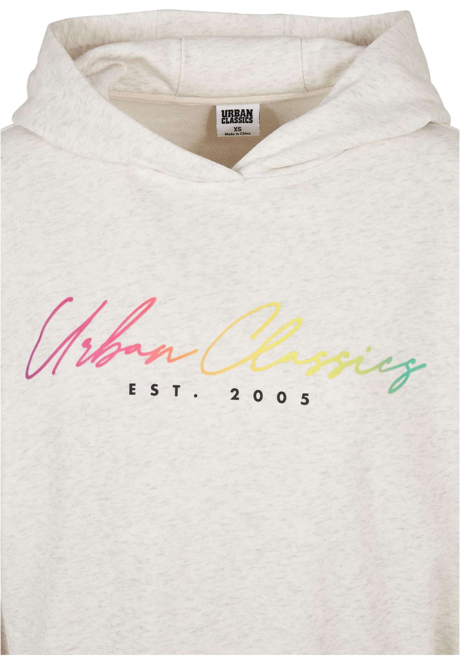 This women’s hoody combines a casual oversize fit with dropped shoulders as well and an unusual branding on the front, where an Urban Classics lettering runs across the chest in rainbow colors. The harmonious look is rounded off by a large hood and wide rib cuffs on sleeves and hem. Made of soft terry fabric, it is a delight to wear.
