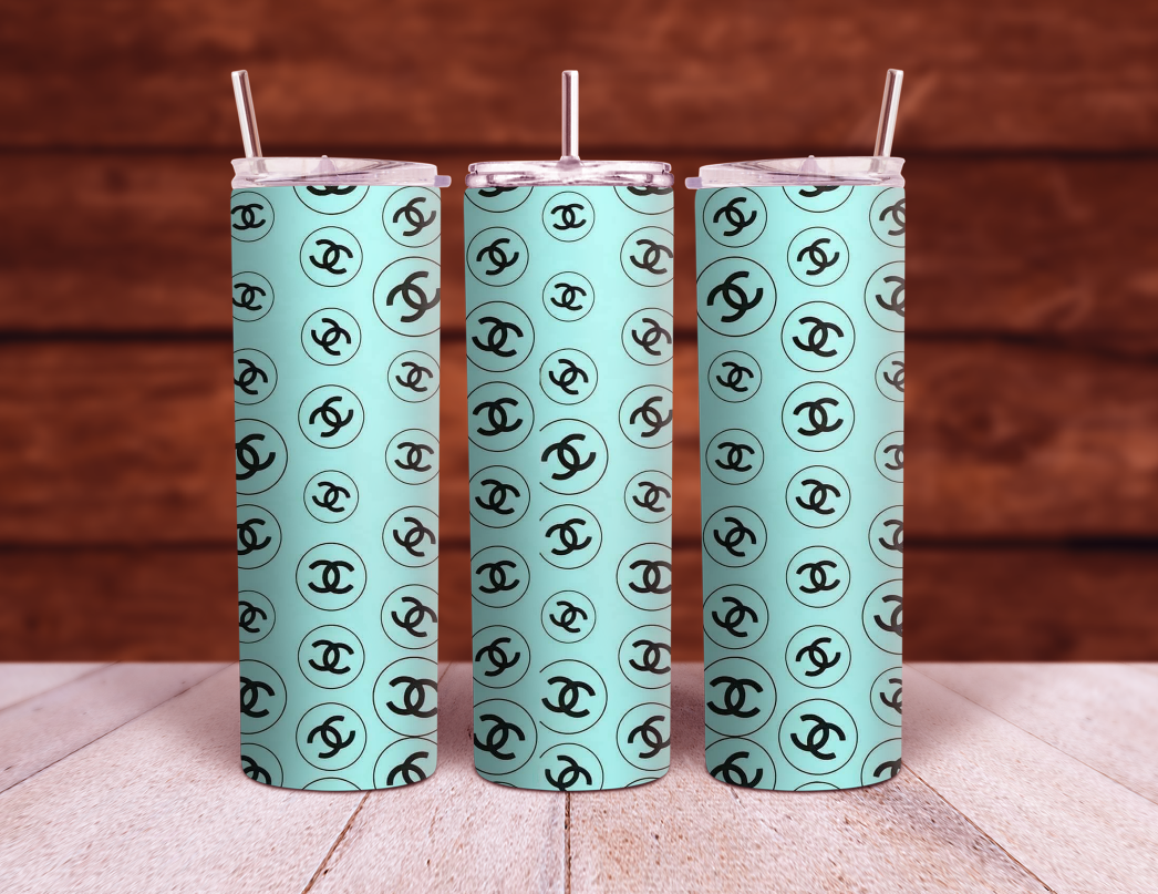 Coco Chanel logo on blue background 20oz and 30oz Sublimation Tumbler Wrap PNG