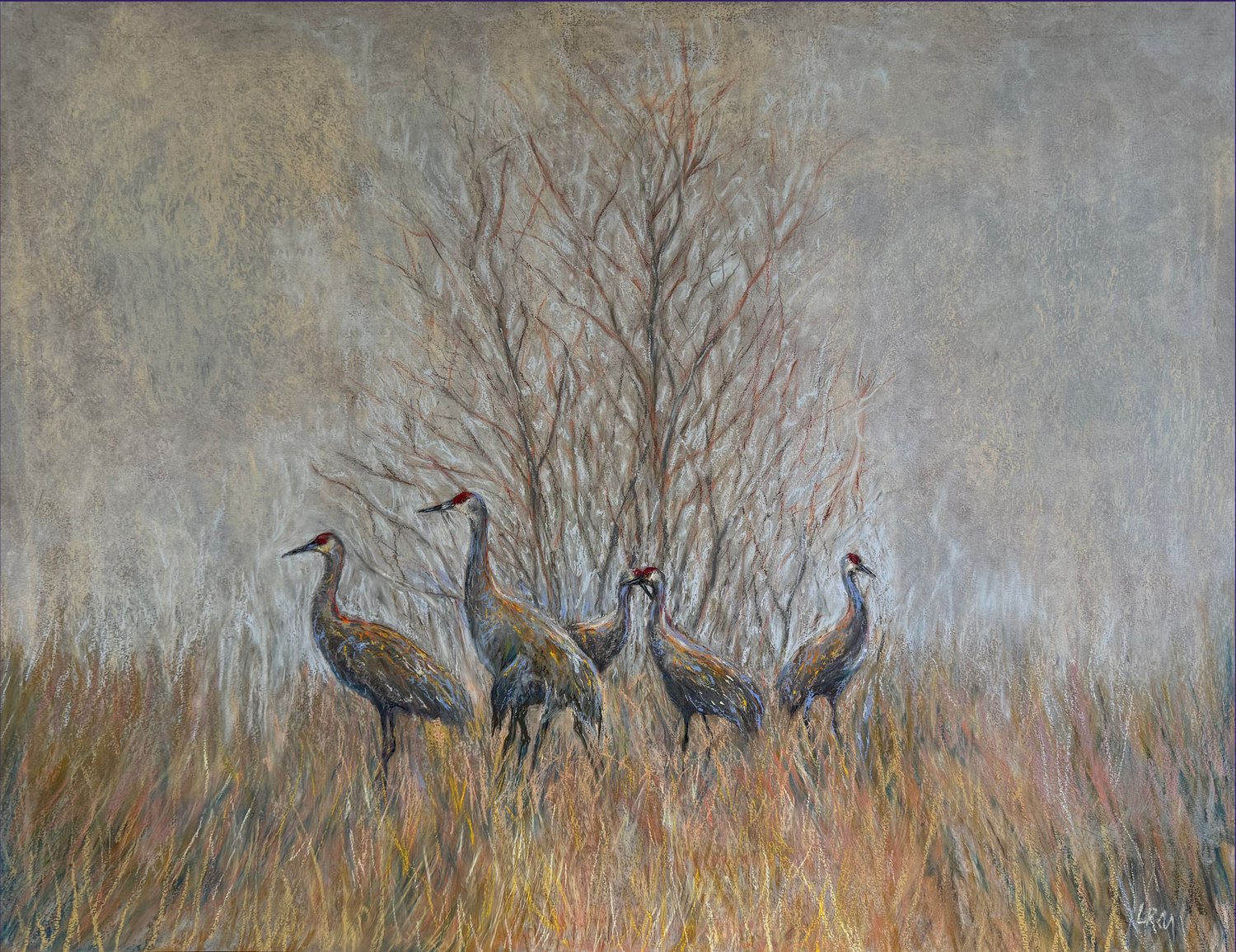"Mourning in the Fog" reflects the heavy toll avian flu has taken on Sandhill Cranes this year in Indiana. The muted tones and misty background mirror the uncertainty and loss these birds face. Despite the hardship, they stand together—a quiet moment of resilience. This piece was inspired by a photograph of sandhill cranes taken by local photographer Jeff Basham.