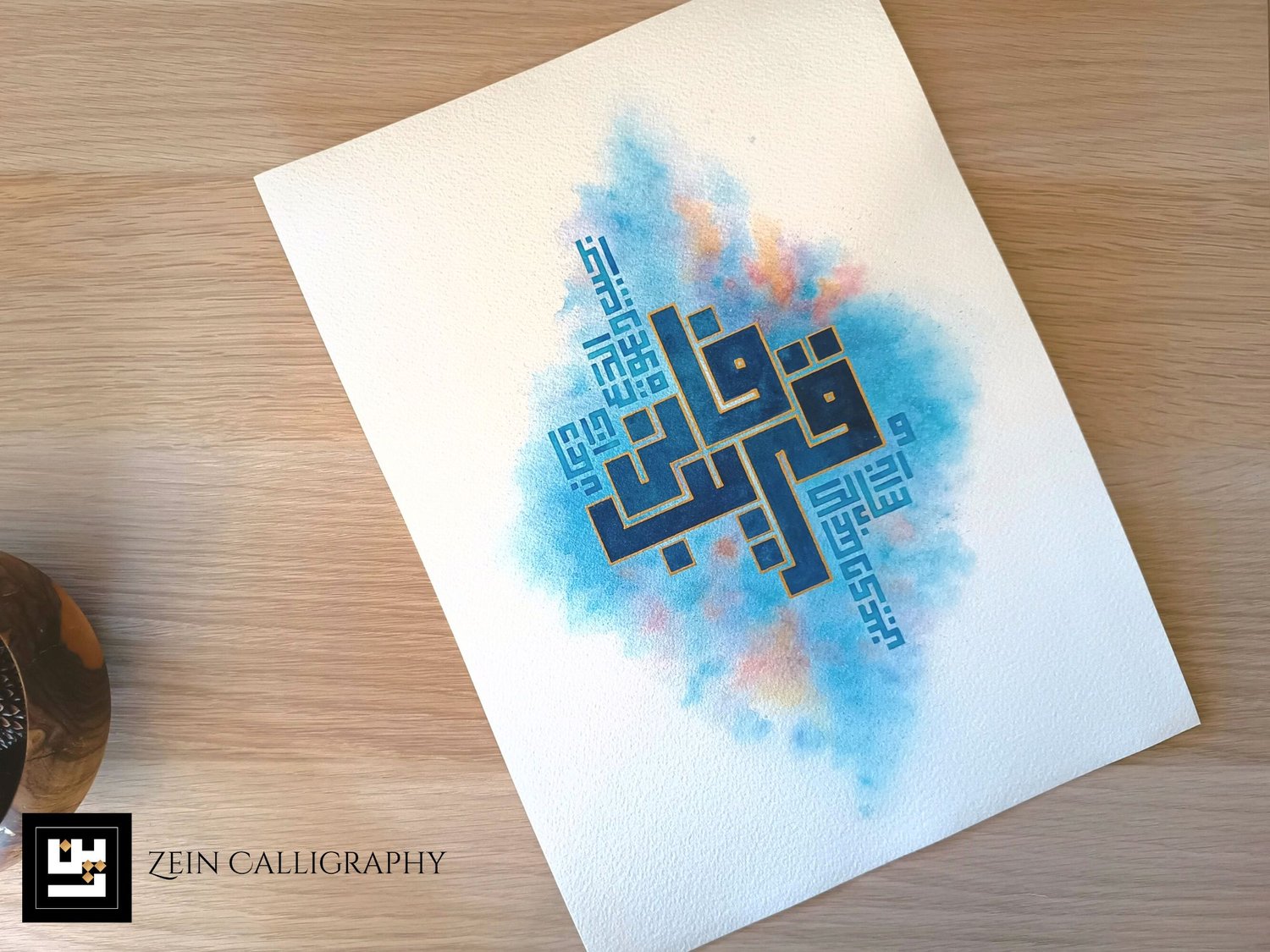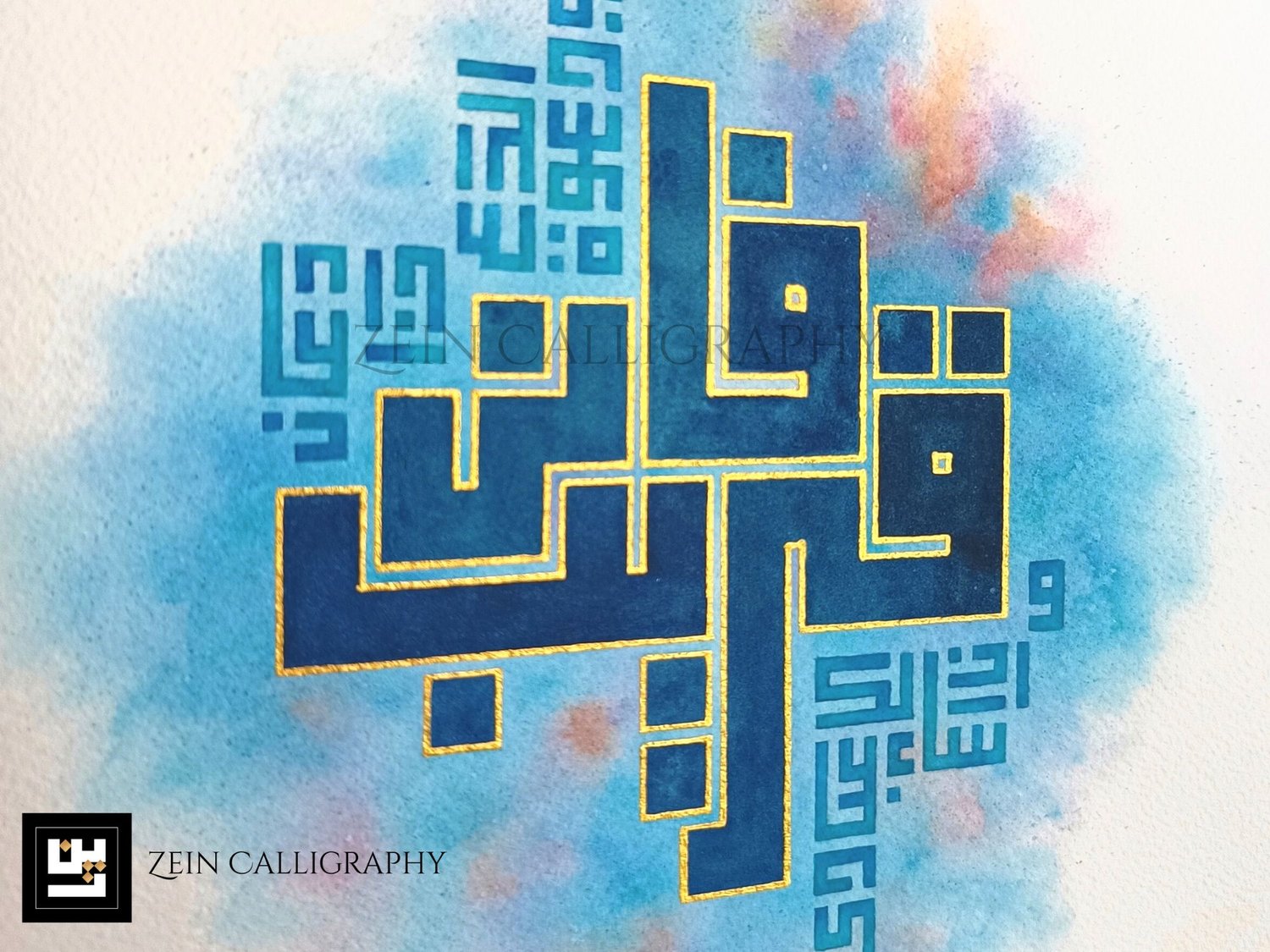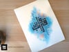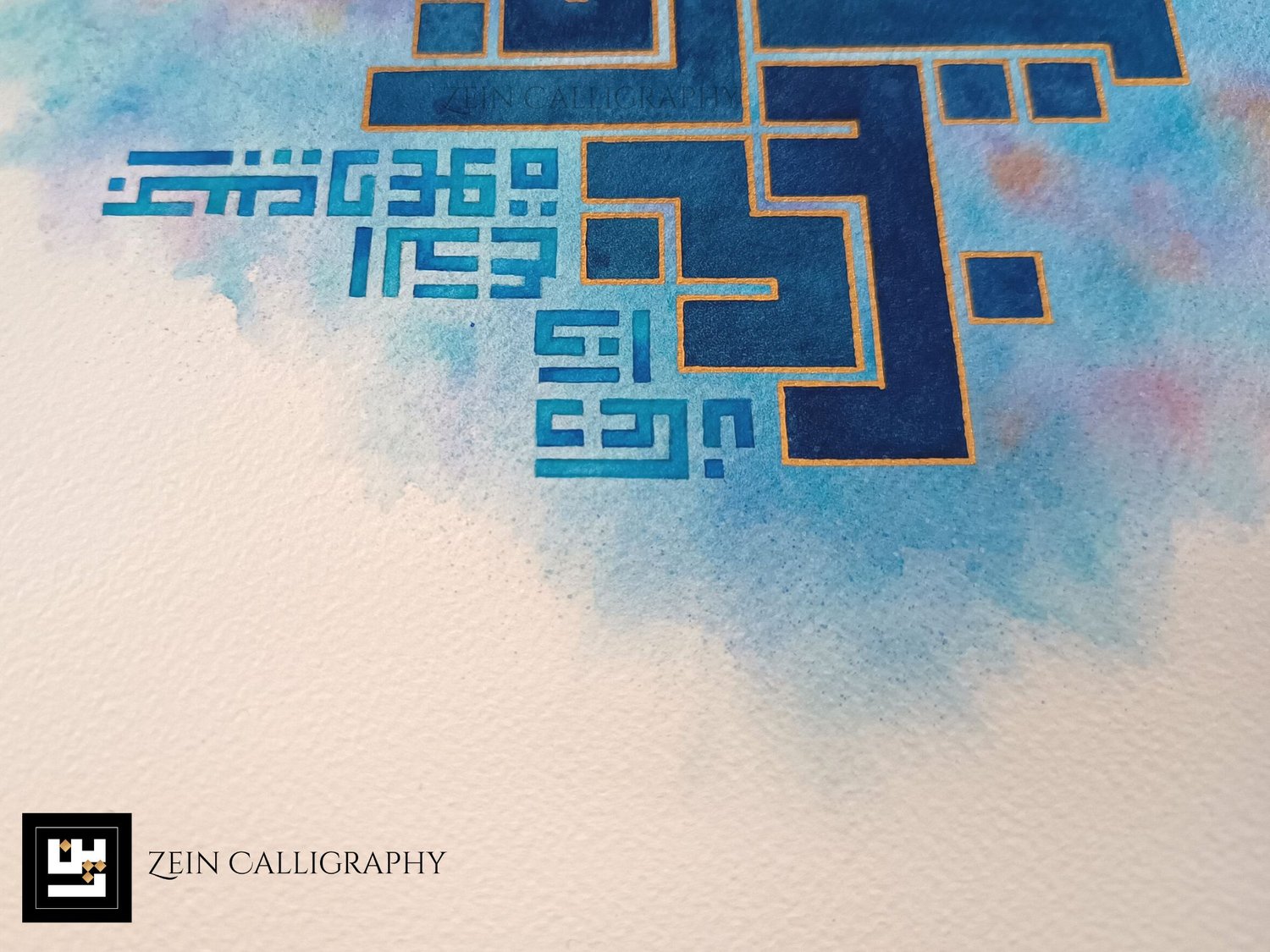 This is an original one-of-a-kind piece, painted by hand. I've painted the Kufi lettering in shades of blue watercolour on 100% cotton cold pressed paper. The center lettering is outlined in gold paint.