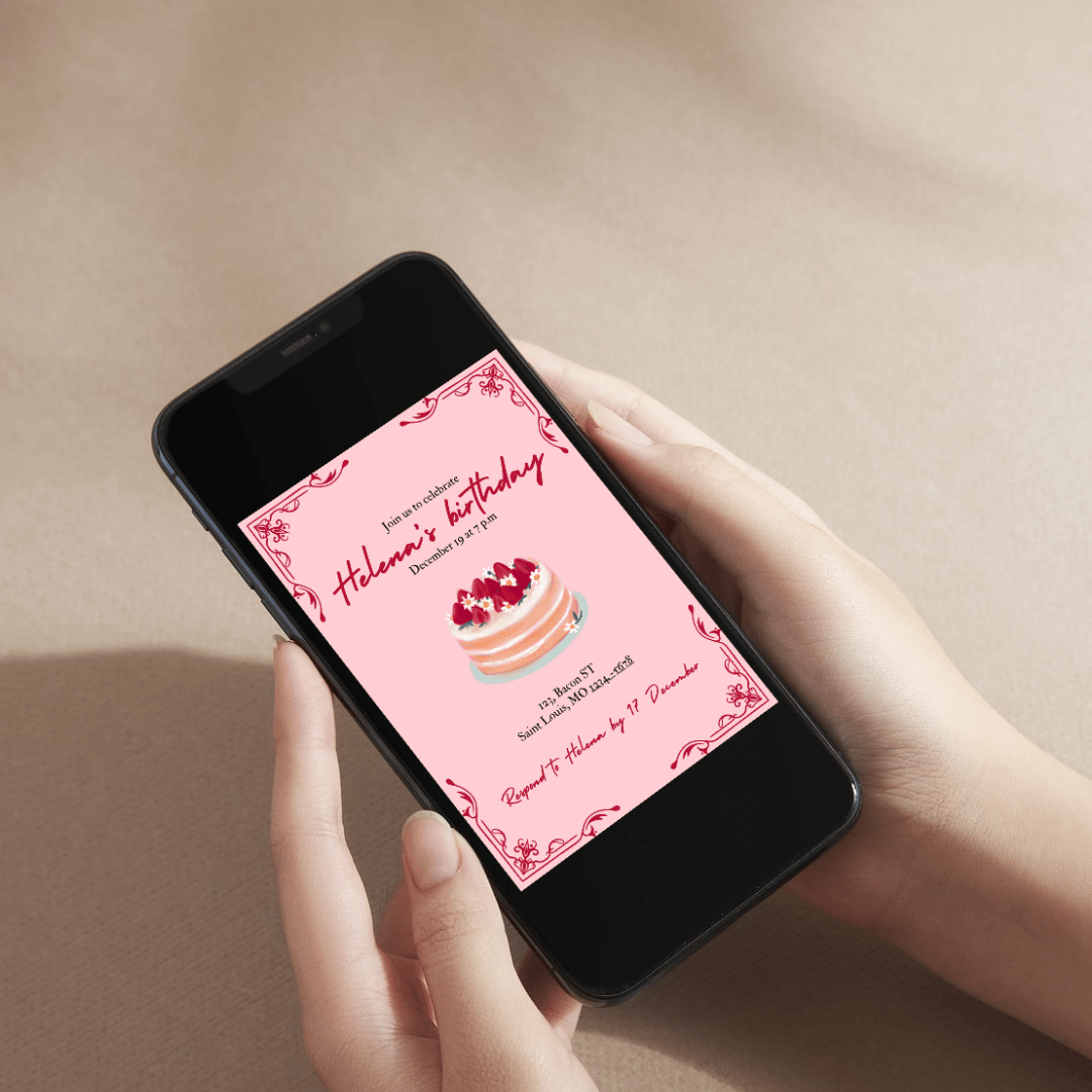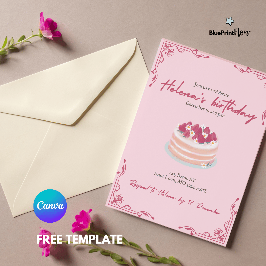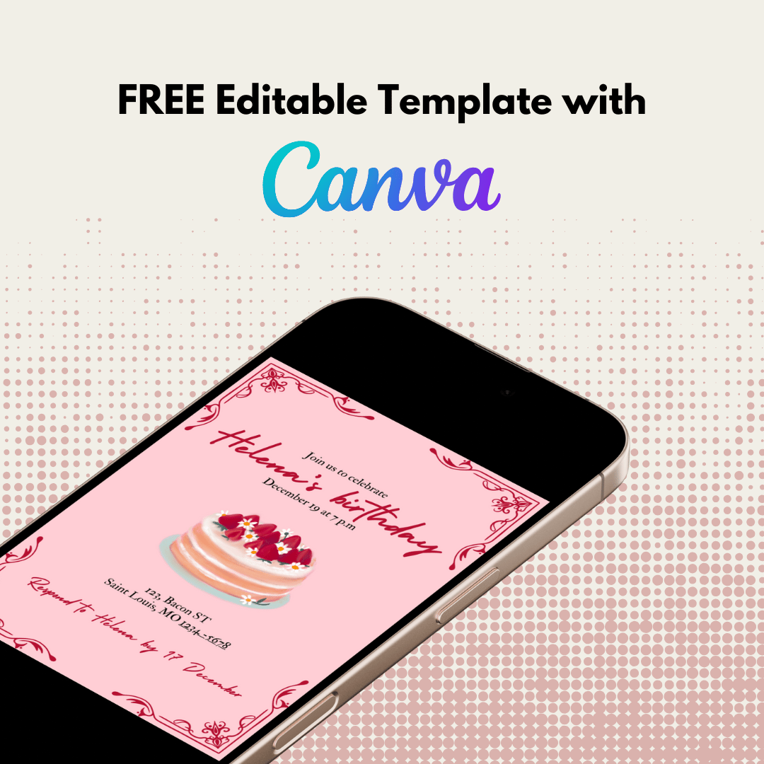 Featuring a classic red and pink design, elegant floral corners, and a delightful illustration of a strawberry cake, this free editable Canva template perfectly blends sweetness and sophistication. Ideal for adding a personal touch to your event!