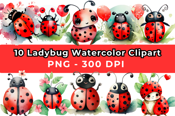 10 Ladybug Clipart in Watercolor PNG files in size: 5000 x 5000 pixels in 300 DPI with transparent background.