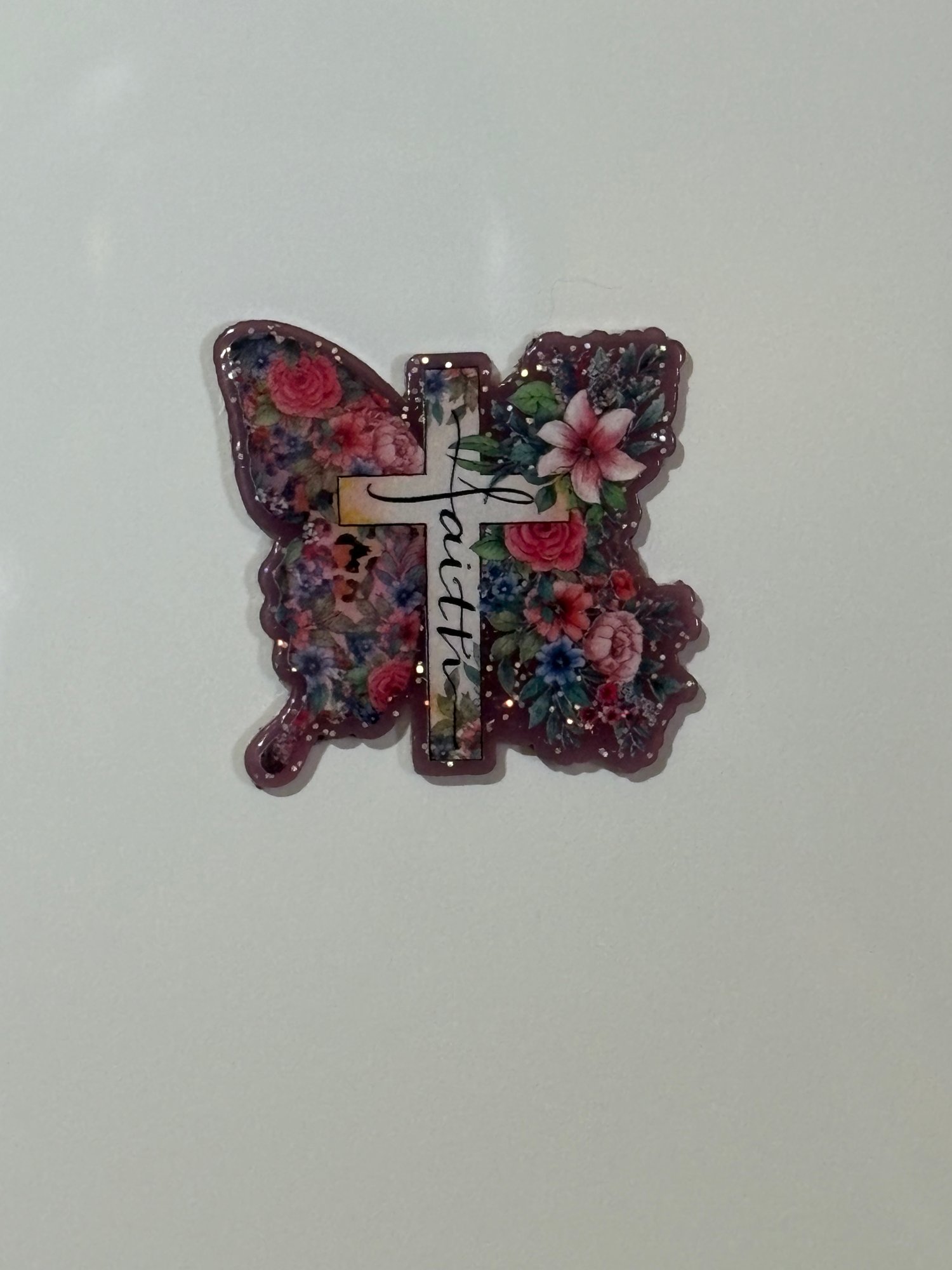 A stunning blend of faith and transformation this floral butterfly magnet features a cross at the center with the word Faith.