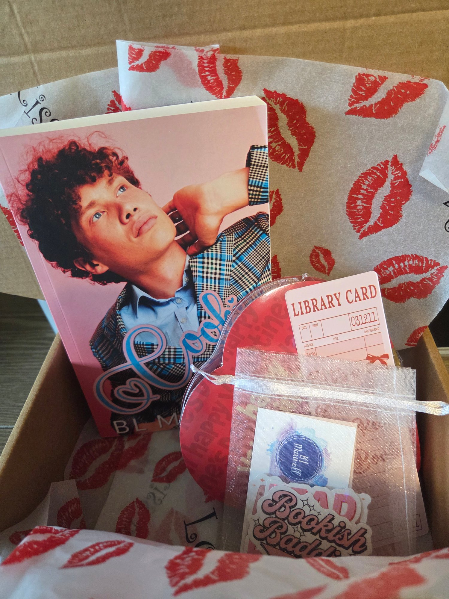 Heart shaped box of chocolate, bookmarks, and a random sticker selection.