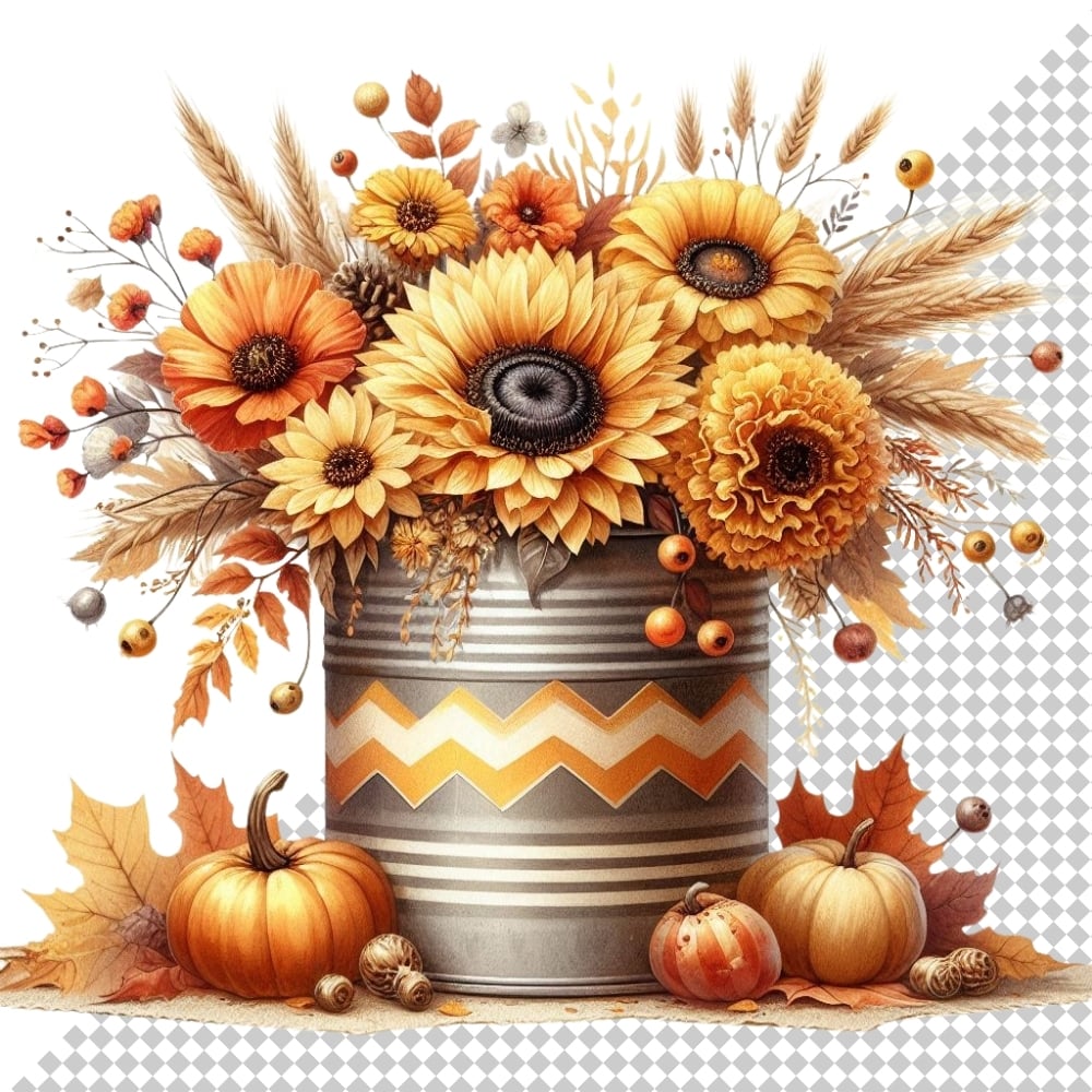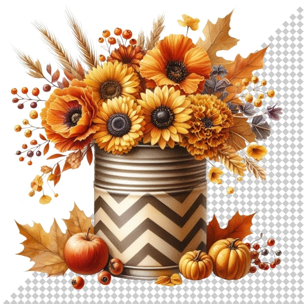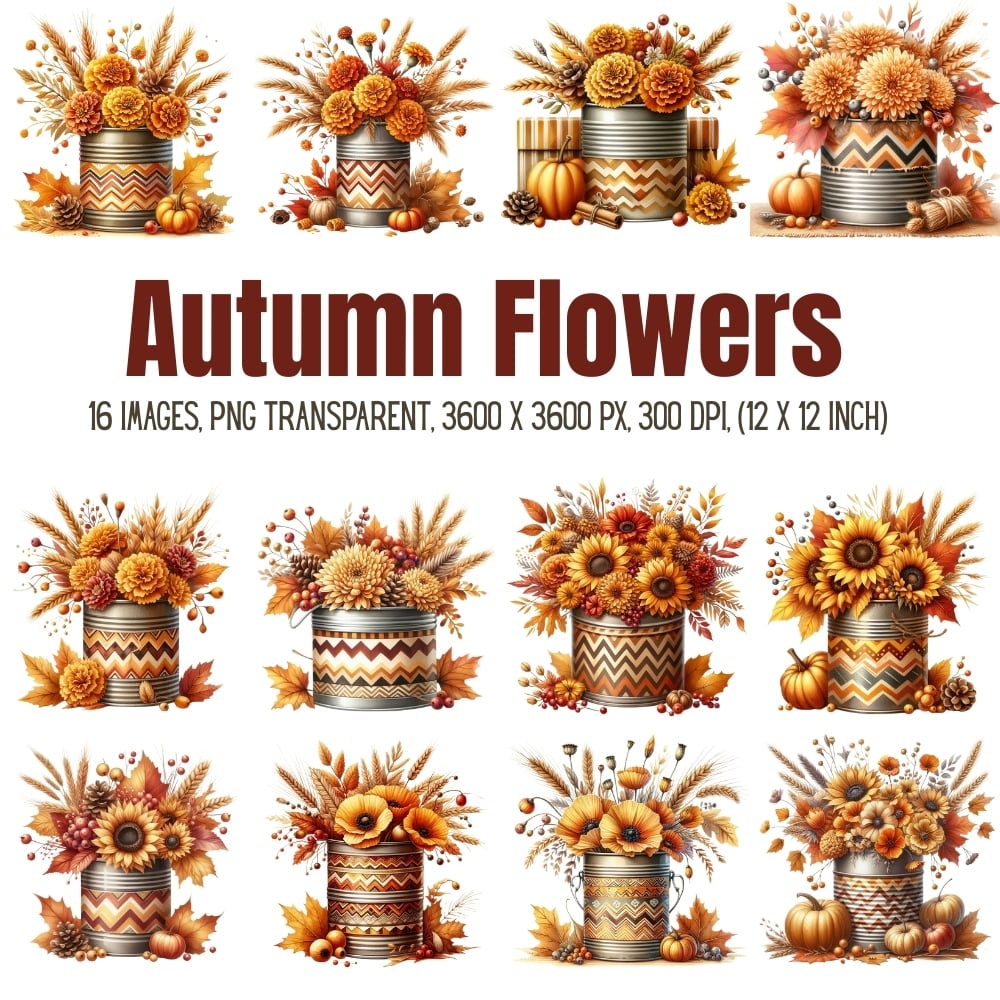 Celebrate the cozy charm of fall with this beautifully curated collection of 16 high-resolution PNG images featuring autumn-themed floral arrangements. Each design showcases warm seasonal hues—think rich oranges, golden yellows, and rustic browns—arranged in stylish chevron-patterned containers, perfect for adding a festive touch to your creative projects.