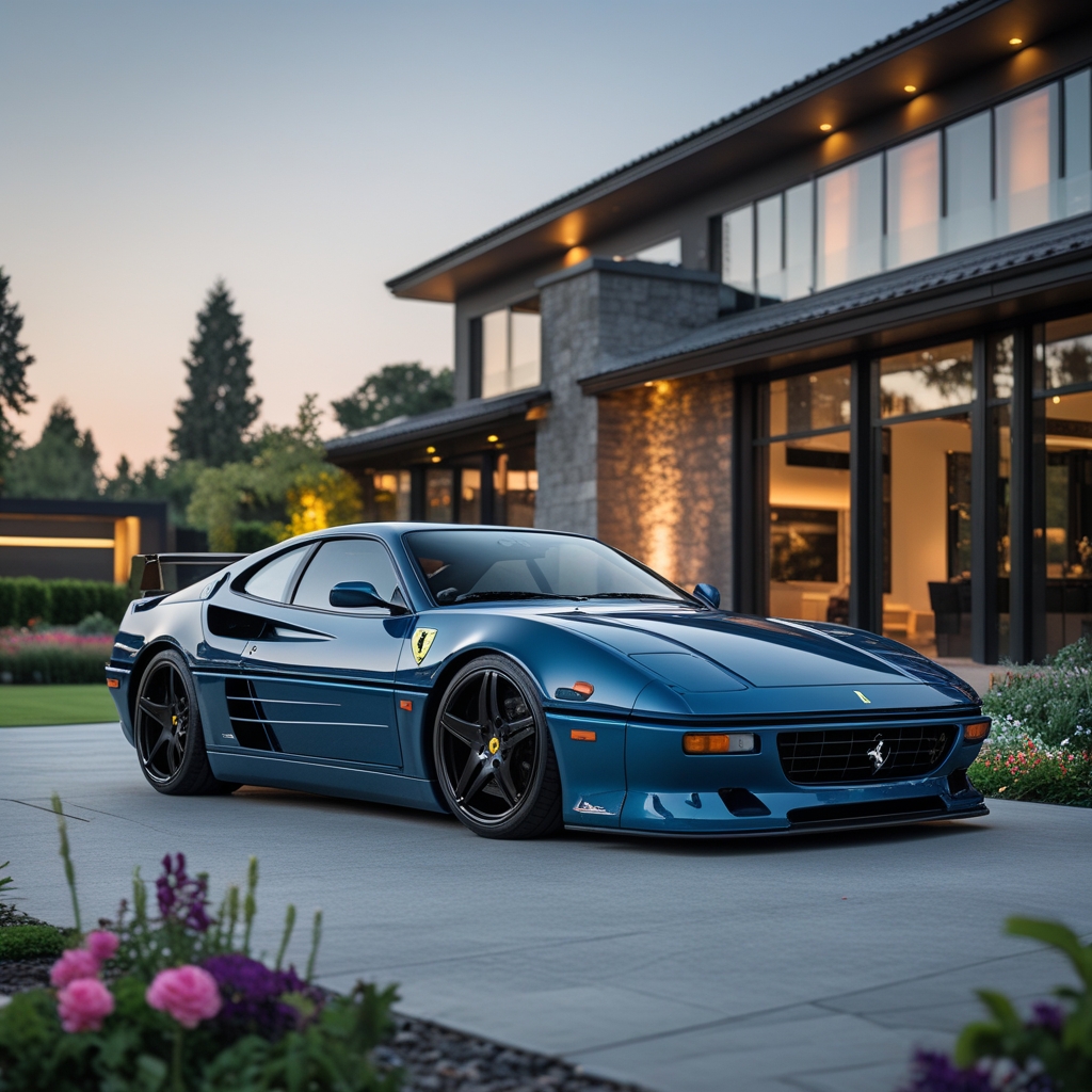"A Ferrari Luce in a deep Smalt blue, fully customized with a Mansory body kit, featuring sleek matte black mags wheels, parked elegantly in the driveway of a luxury modern farmhouse. The house has large glass windows, clean lines, and contemporary architecture. Surrounding the driveway is a beautifully landscaped garden with lush greenery, colorful flowers, and subtle ambient lighting. The scene is captured in soft natural daylight, emphasizing the glossy blue of the car, the matte black wheels, and the luxurious, serene atmosphere of the modern farmhouse estate."