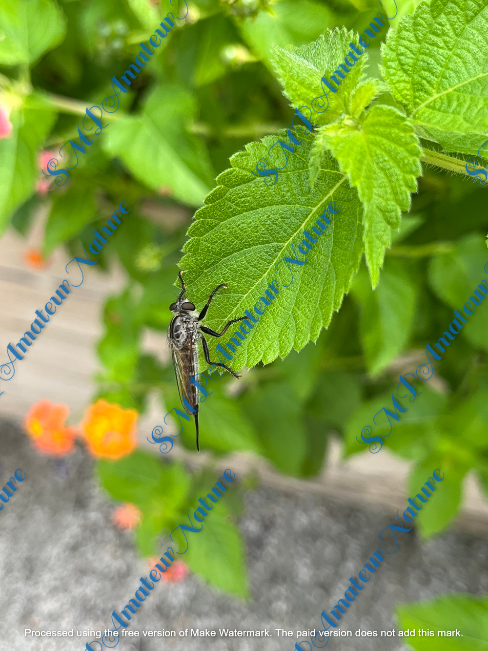 Amateur photograph of a Northeastern Hammertail Robber Fly female (Efferia aestuans) resting on a leaf. Image taken in Virginia, USA. Image pixels 3024x4032. Image easily resized as required for buyer needs. Purchase gives image without any watermark.