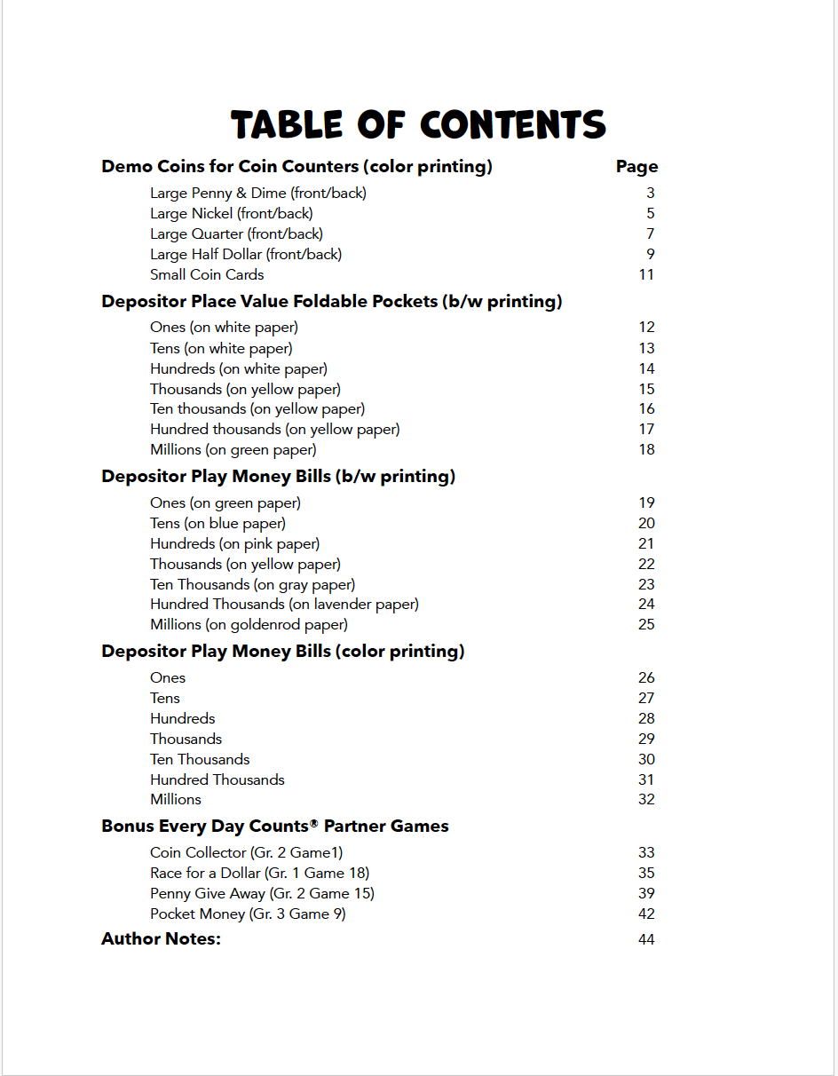 - Author Notes with instructions and helpful tips for using the Demo Coins, Depositor and Bills, and Partner Games in your classroom