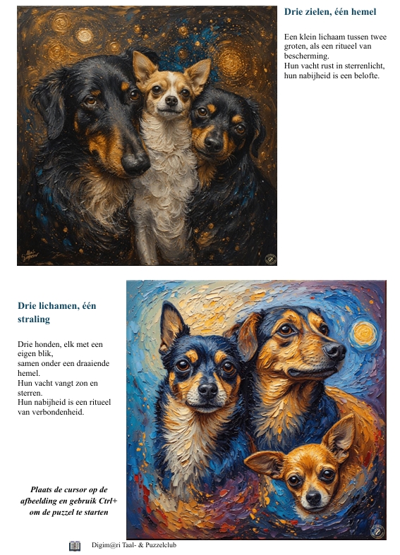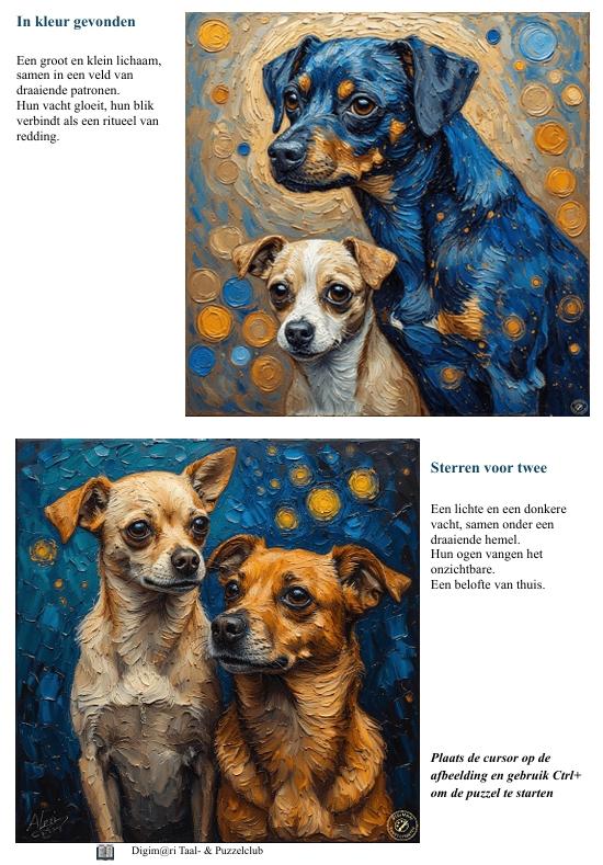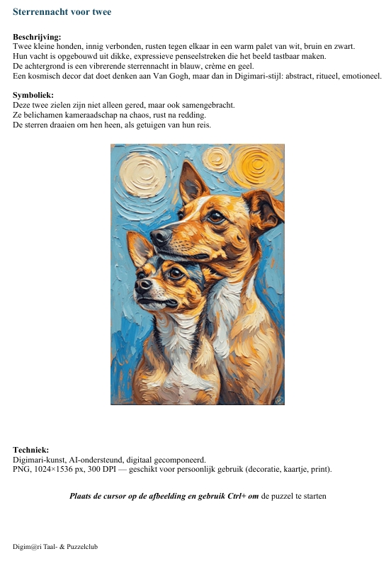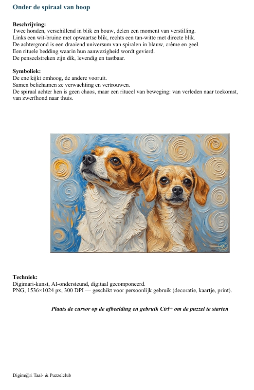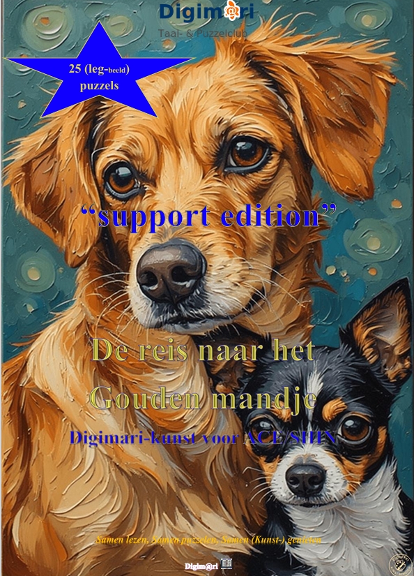 Het Digim@ri "Gouden mandje" puzzelboek is een exclusieve digitale collectie van 25 unieke honden‑legpuzzels, ontworpen voor iedereen die houdt van honden, kunst en betekenisvolle projecten.