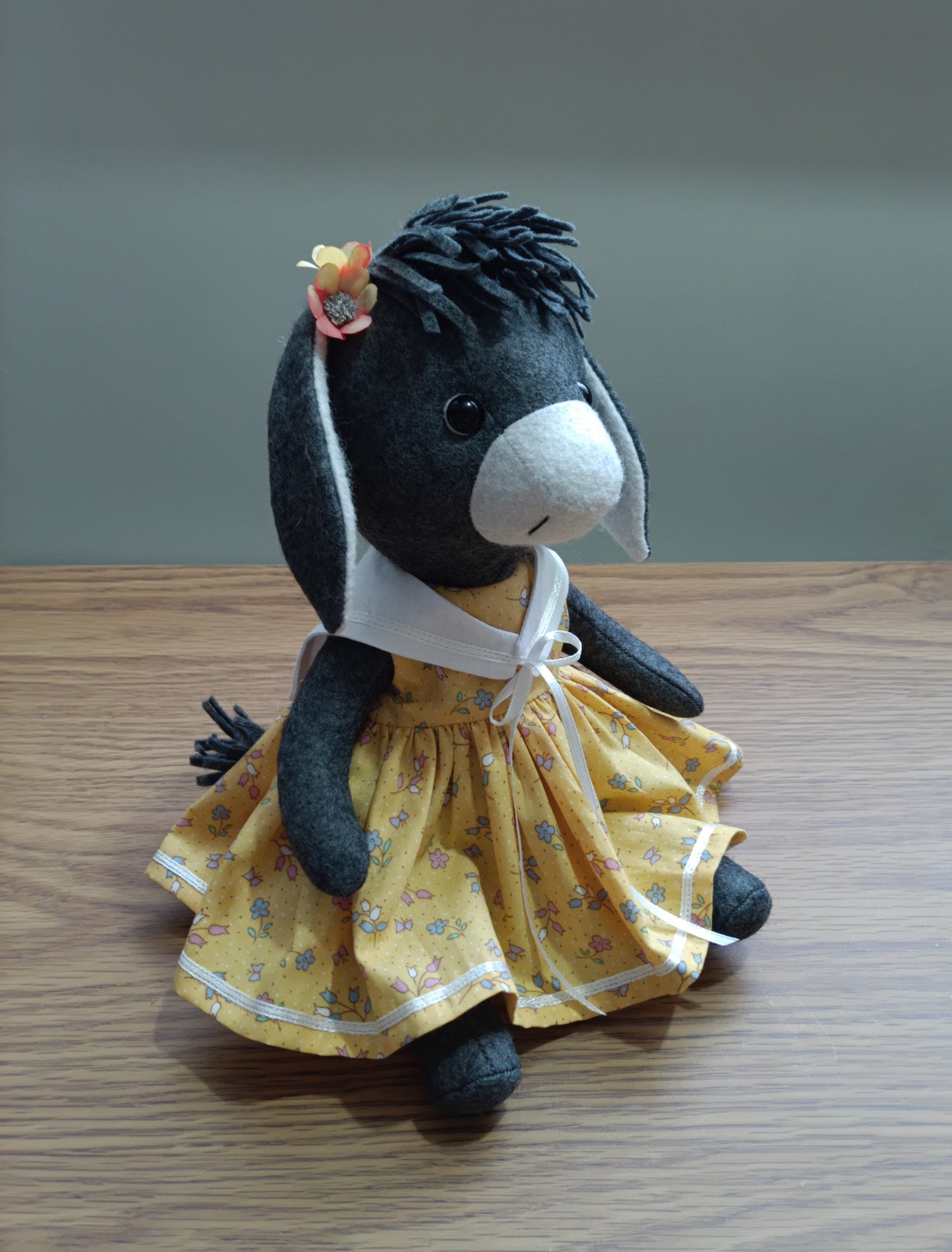 Peggy is a lovely little donkey made in felt, she is about 10inch from head to toe, included in the pattern is her dress and sailor collar