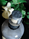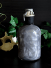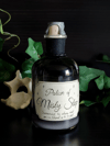Pullossa on mustaa nestettä ja se on koristeltu käsintehdyllä etiketillä, mustalla narulla sekä nahkanyörillä.