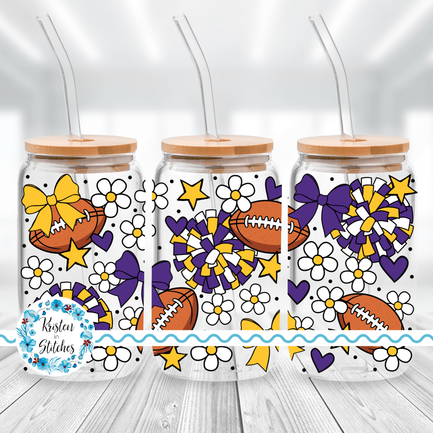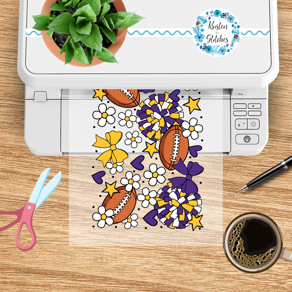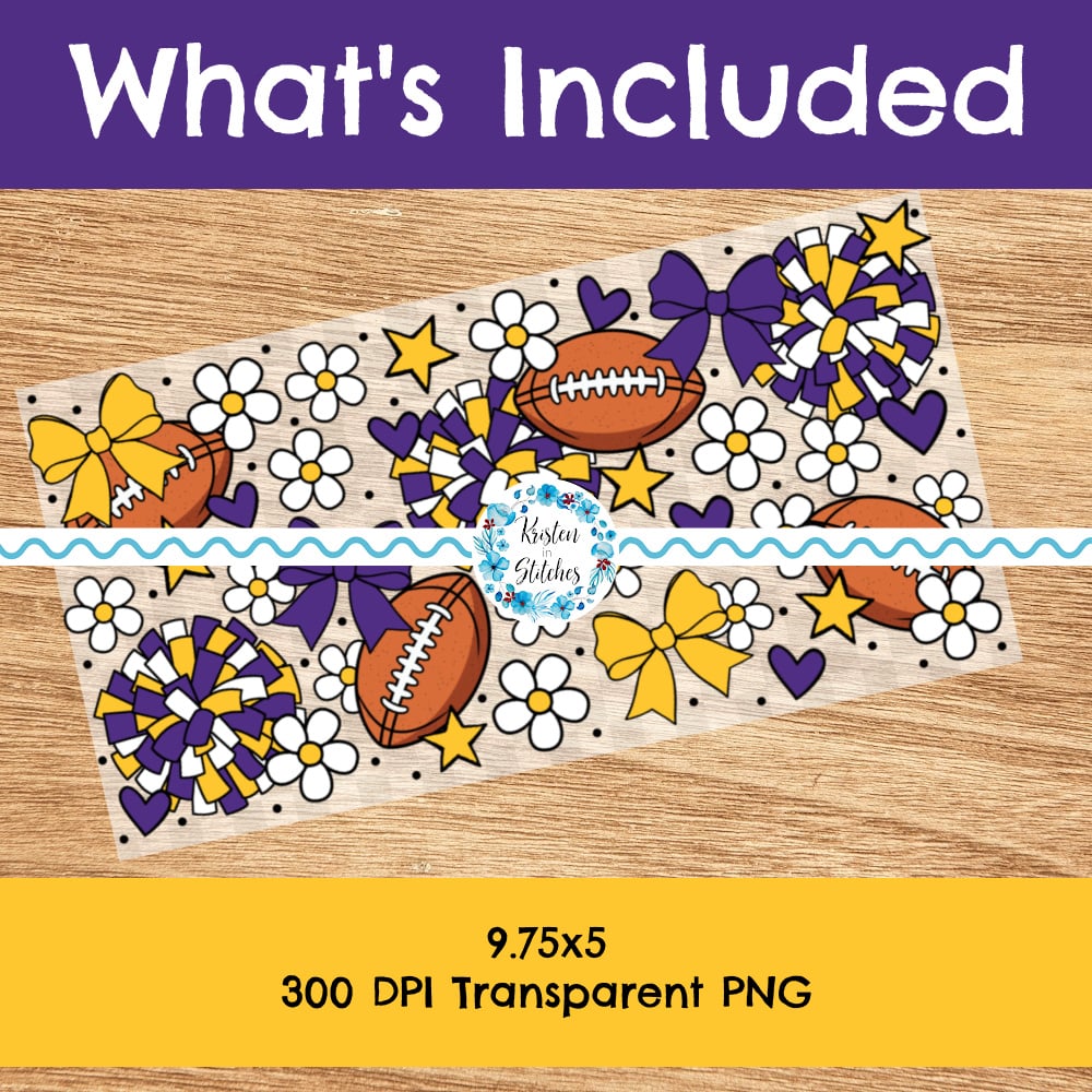 Features footballs, pompoms, bows and flowers in Vikings cheerleader colors.