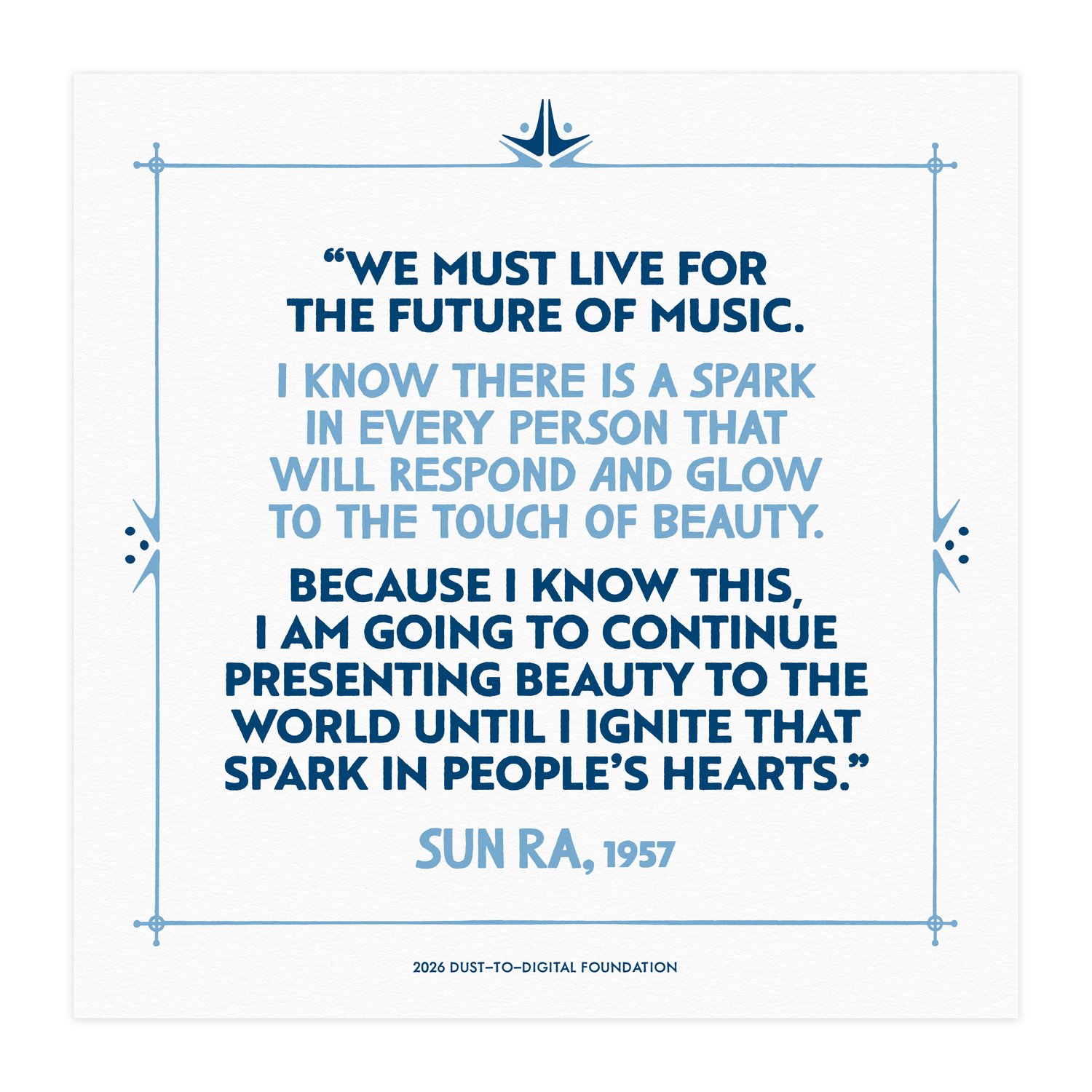 A limited-edition donor poster supporting the Dust-to-Digital Foundation’s mission to preserve, share, and celebrate the world’s music. Featuring a licensed 1957 quote from Sun Ra. Ships mid-January 2026.
