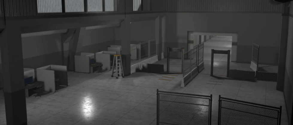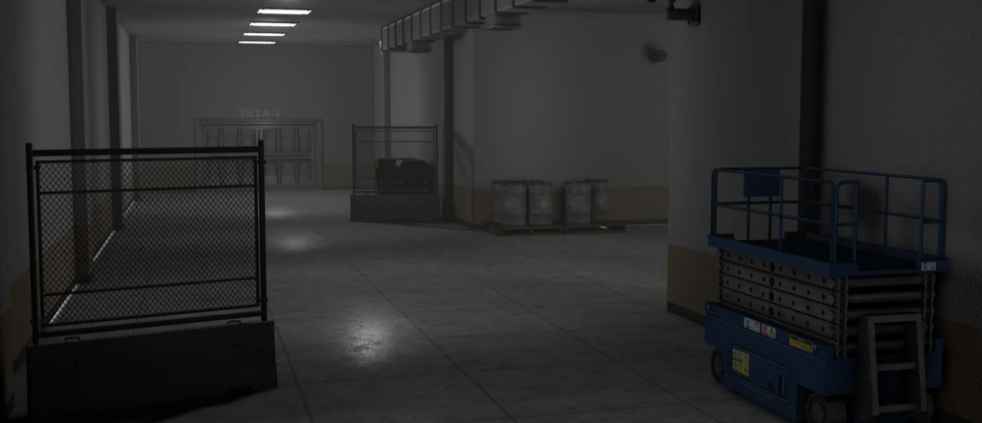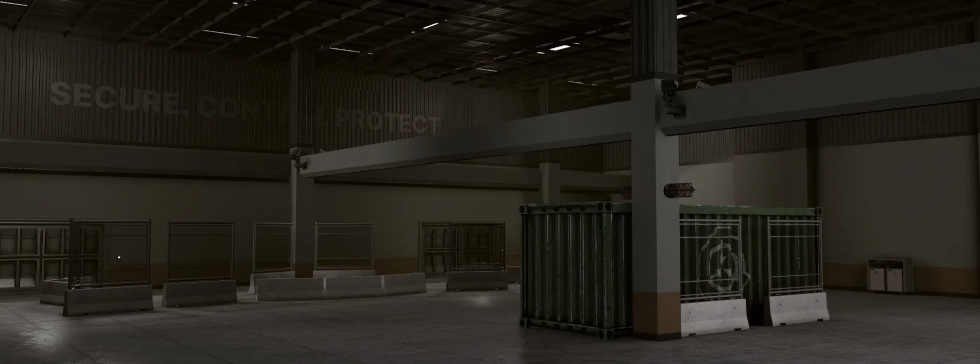 - Detailed facility props including pipes, lighting fixtures, and ventilation systems