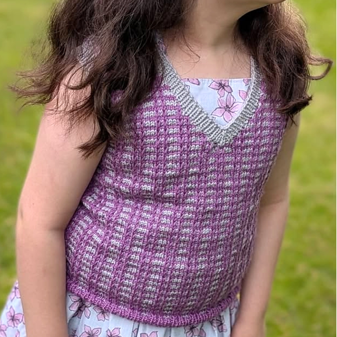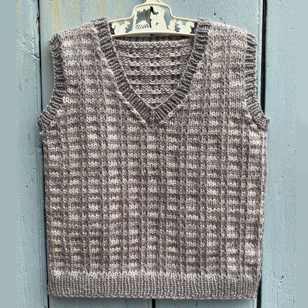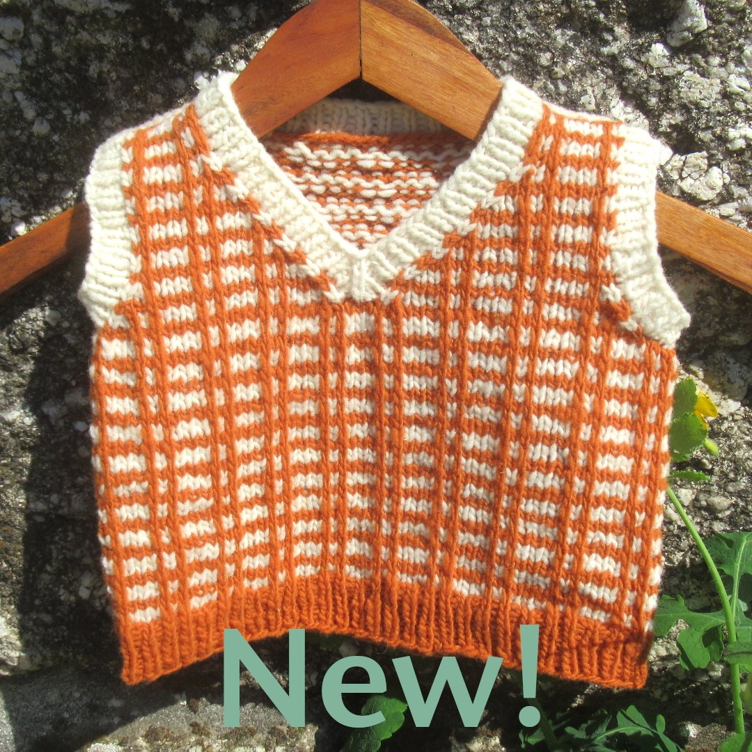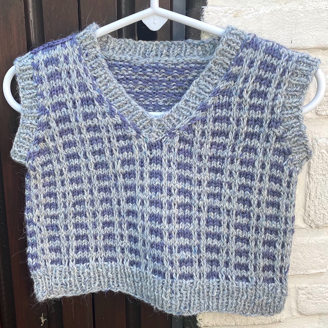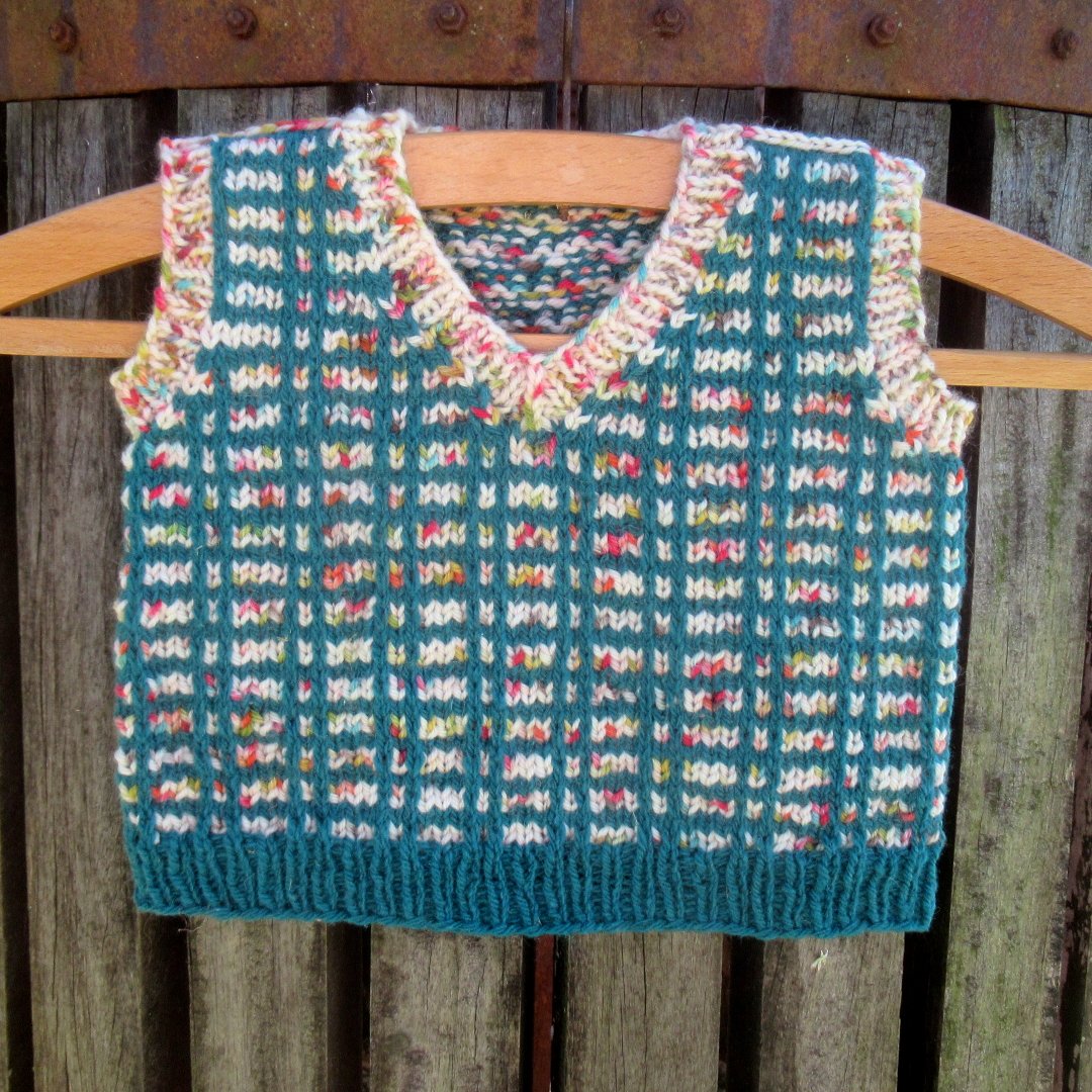 The Oblongo tank top is knitted bottom up until the armholes and then the fronts and back are worked separately. The grid effect is easy to knit: the vertical lines are made using slipped stitches so only one colour is used at a time.