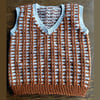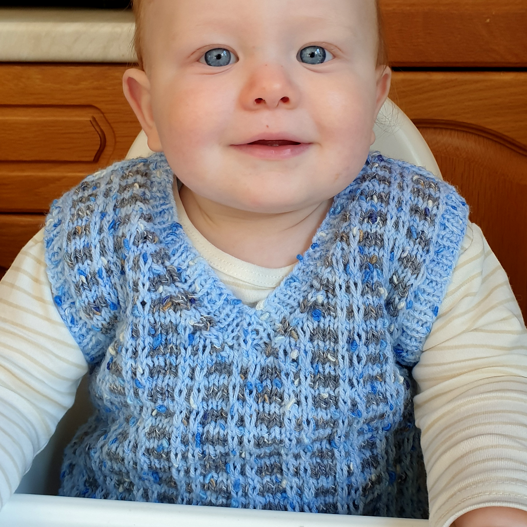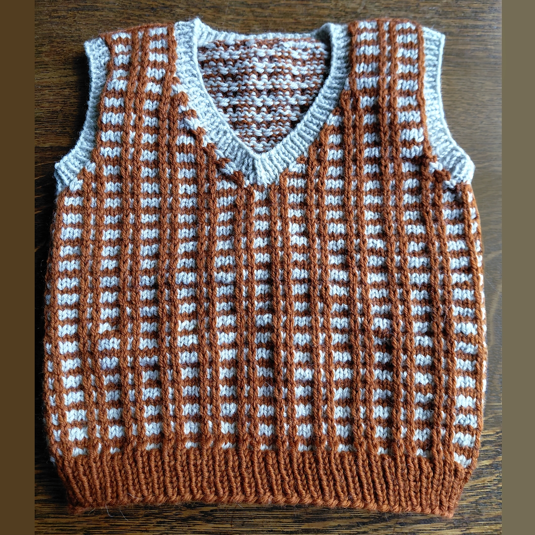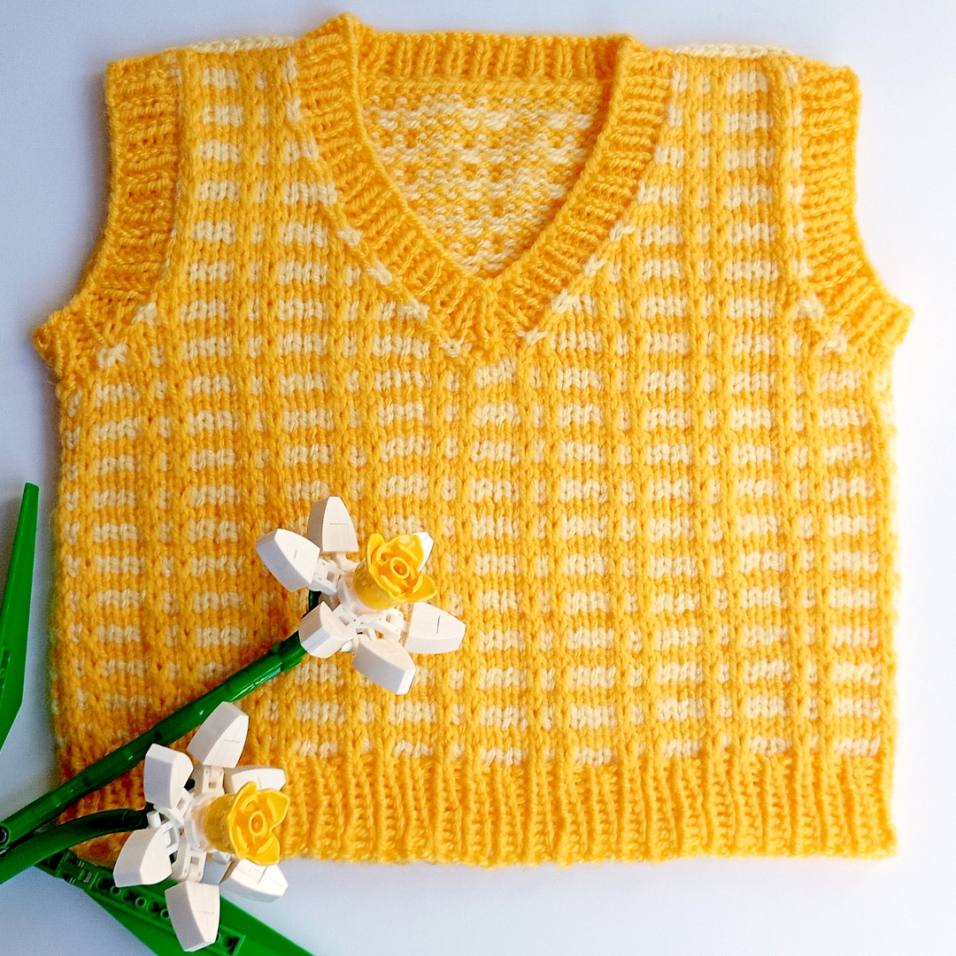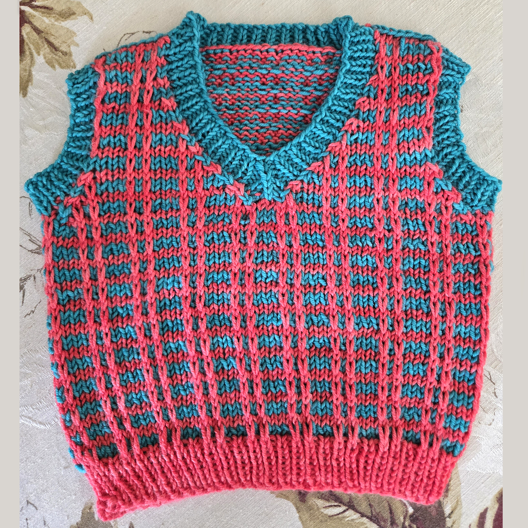 The Oblongo tank top is knitted bottom up until the armholes and then the fronts and back are worked separately. The grid effect is easy to knit: the vertical lines are made using slipped stitches so only one colour is used at a time.
