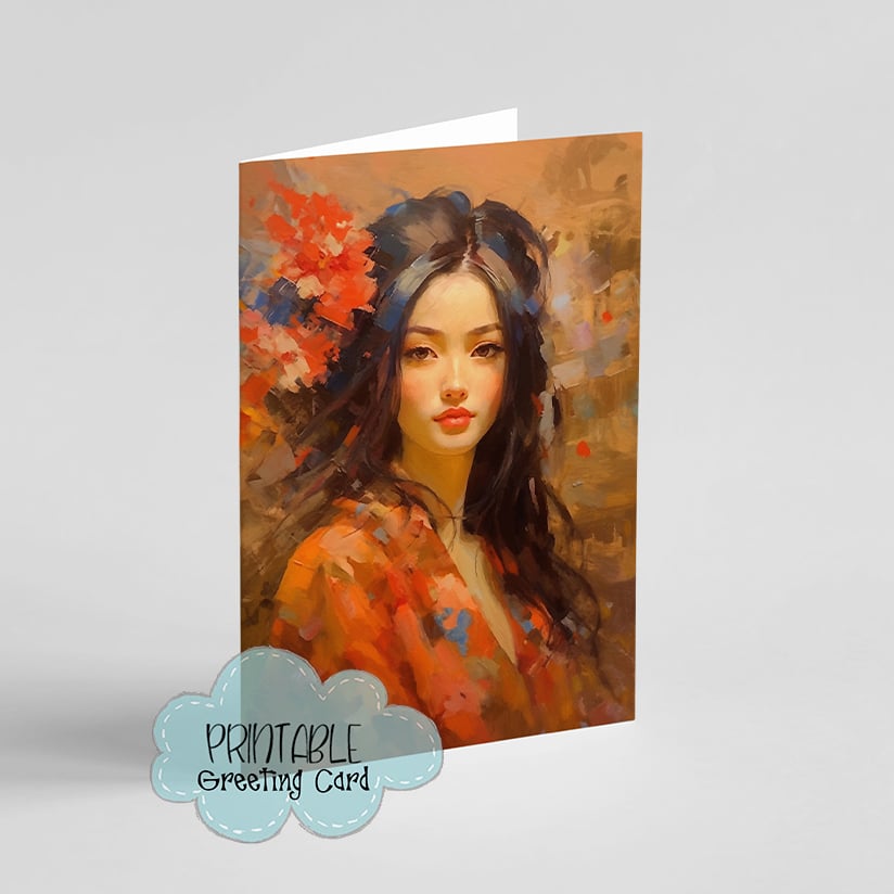 Asian Beauty Printable 5x7 Greeting Card: Red and Blue Floral Elegance