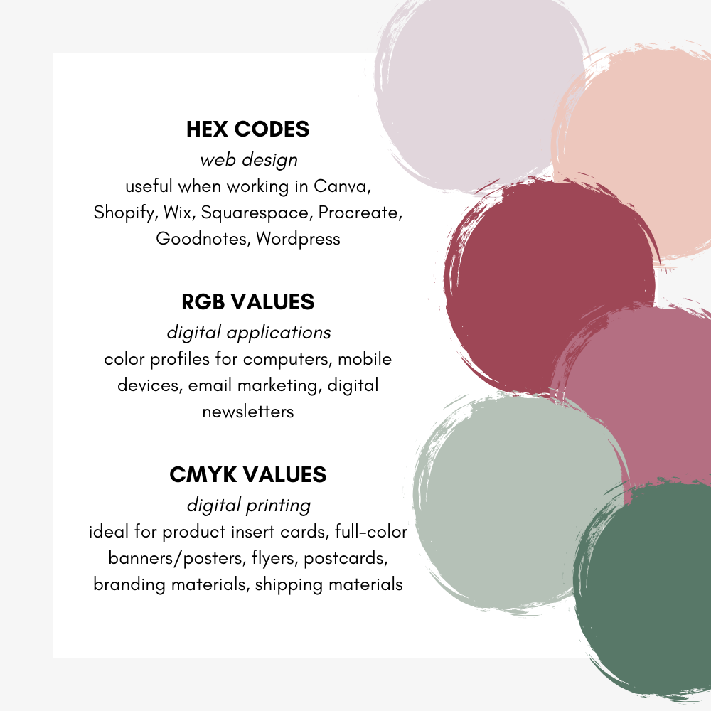 + Detailed Hex Codes, RGB, and CMYK values for each color