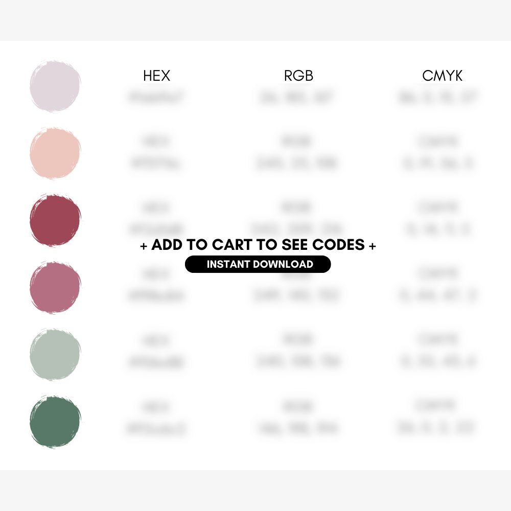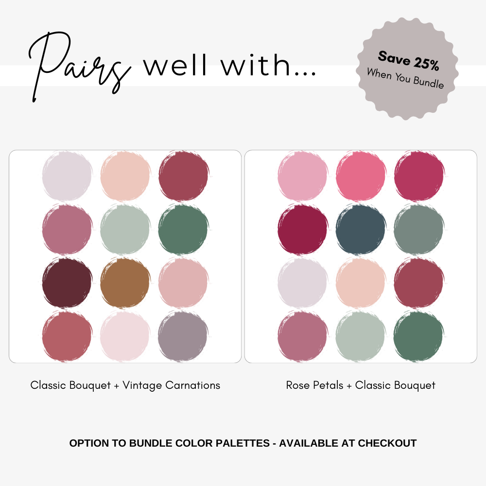 Introducing the Classic Bouquet Color Palette—a stunning collection of digital swatches designed to elevate your brand's aesthetic. This carefully curated palette features enchanting hues of dusty pale lavender, pastel peach, muted cherry red, rose pink, sage green, and dark moss green. Perfect for small businesses and creatives, these floral-inspired colors are ideal for crafting cohesive brand colors for your Canva brand kit and Procreate projects. Whether you're designing logos, banners, marketing materials, or packaging, this versatile color scheme will bring a touch of spring to your designs. The package includes precise Hex Codes, RGB, and CMYK values, making it easy to implement across websites, social media, and print. Transform your branding with this elegant mix of colors and watch your brand bloom!