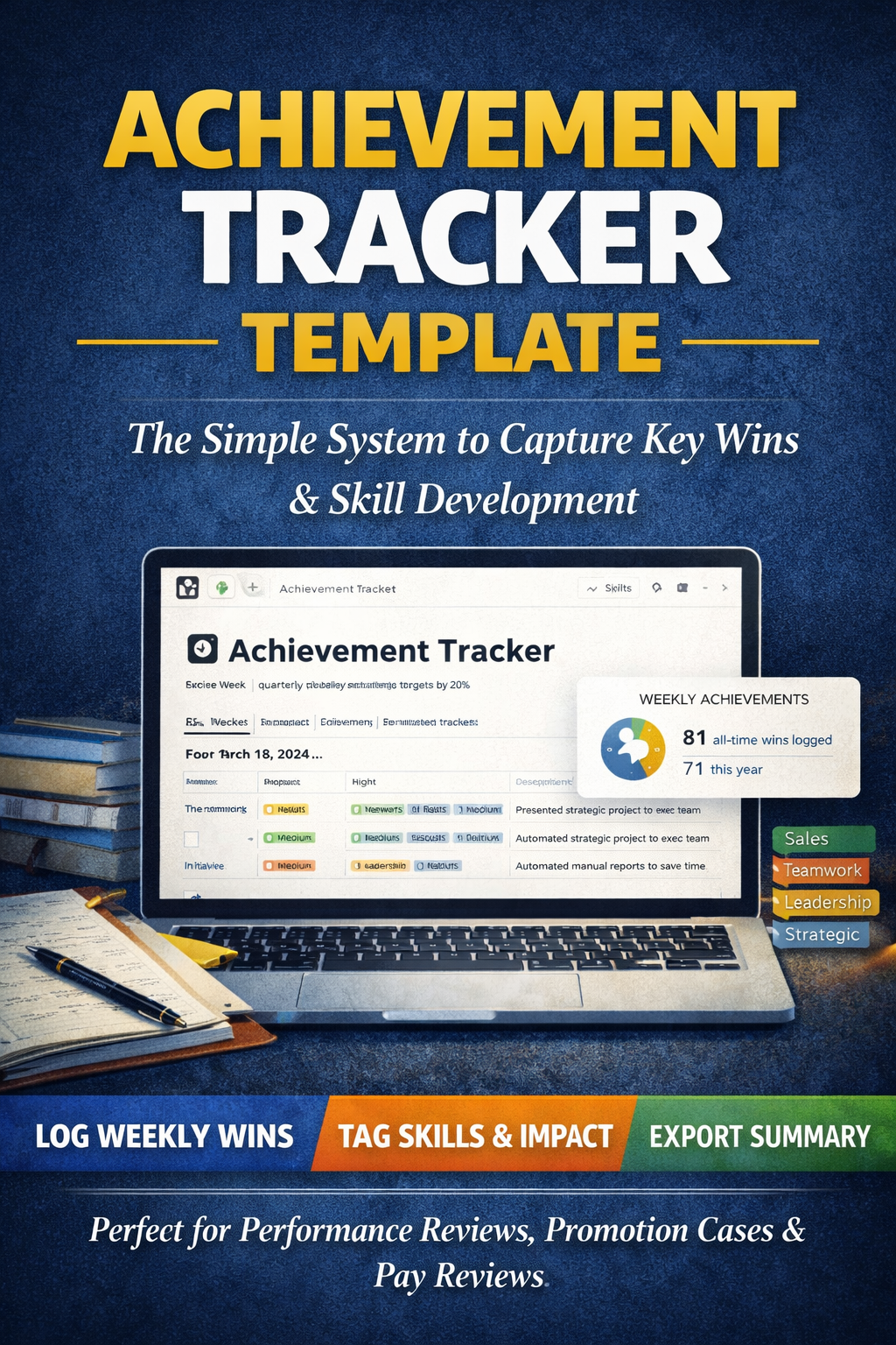 Most professionals do excellent work all year and then go blank when their manager asks what have you achieved. The Achievement Tracker Template fixes that. This Notion workspace gives you a simple system for logging wins weekly, tagging them by skill and impact, and exporting a clean summary when review season arrives. No more last-minute scrambling. No more underselling yourself. Everything is pre-built. You duplicate the template, open it up, and start logging. By your next review, you will have 12 months of organised, tagged, evidence-backed achievements ready to go. Works for performance reviews, promotion cases, pay rise conversations, and LinkedIn content. One purchase. Yours forever.