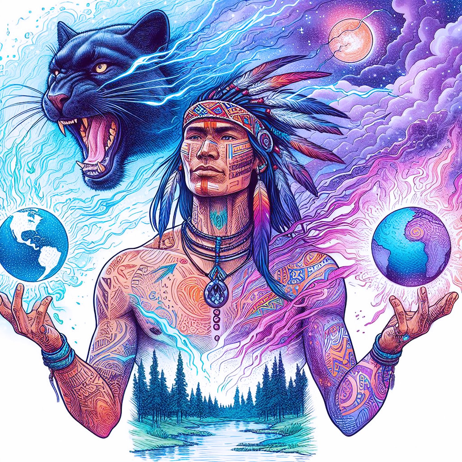 Indian world and spirit Panther & purple turbulent skies. He holds the world in his hands and there is a beautiful lake & trees.