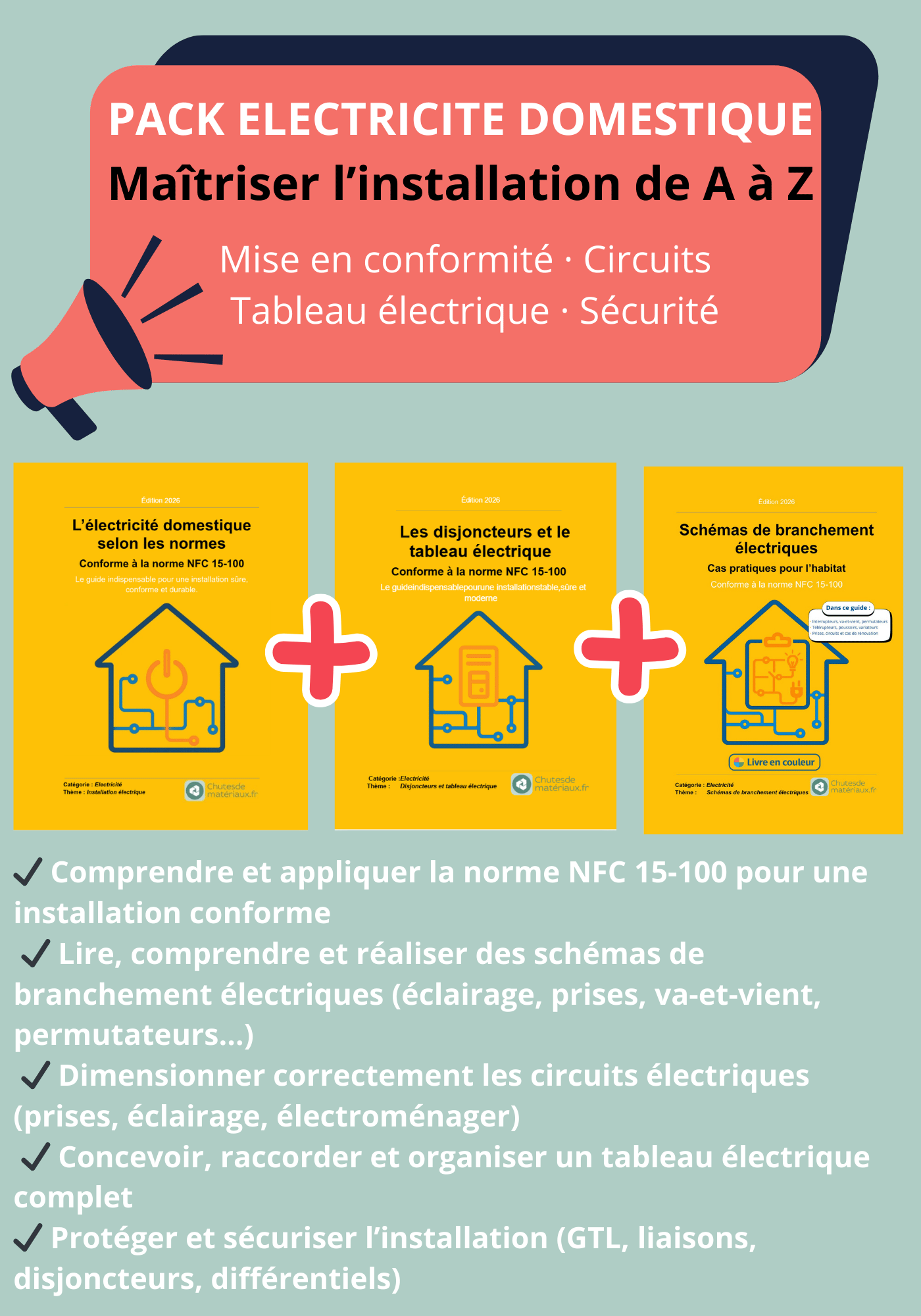 Ce Pack Électricité domestique regroupe les 3 guides indispensables pour maîtriser l’électricité résidentielle de manière claire, structurée et conforme aux normes françaises en vigueur.