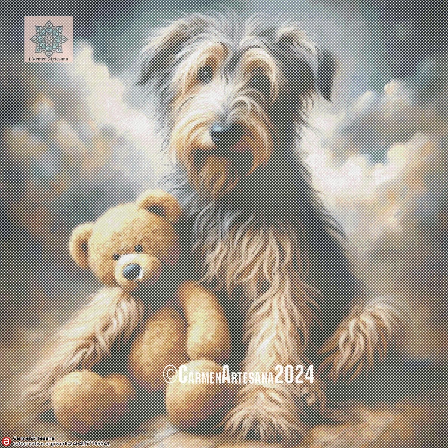 Puppy with Teddy Bear, PDF cross stitch pattern, English/Español. DMC Threads