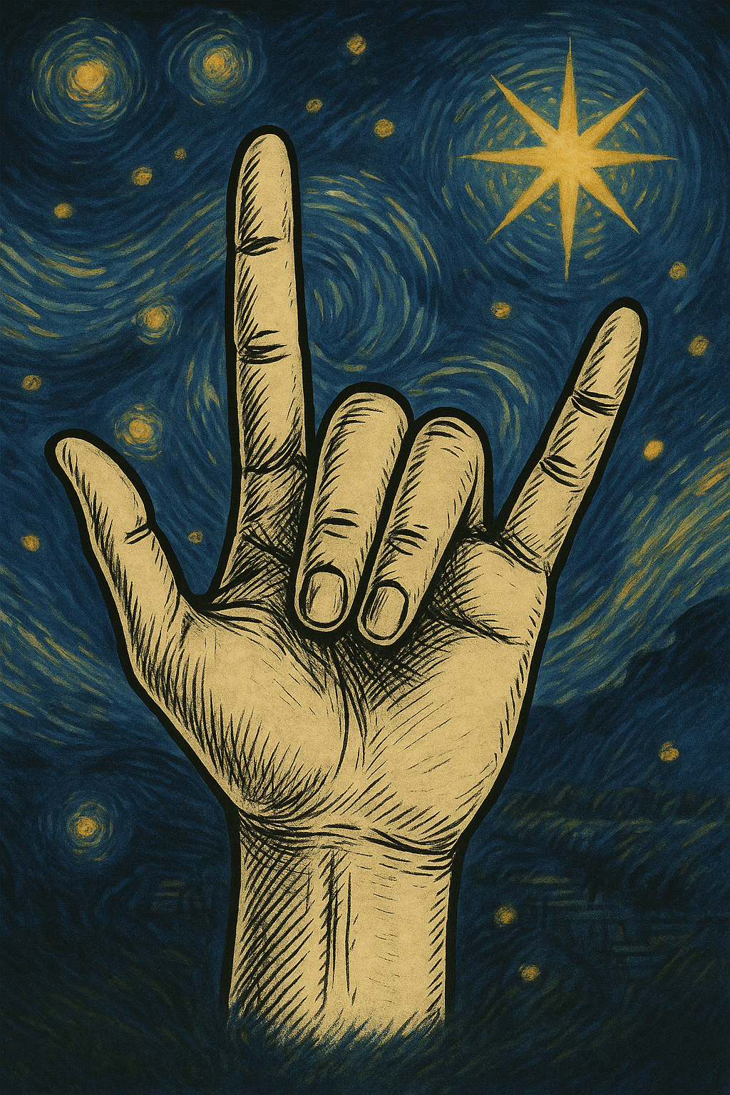 Celebrate art and Deaf culture with this stunning Starry Night–inspired ASL “I Love You” poster.