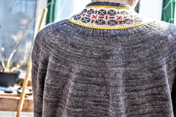 Gander is a walk in the woods; crisp and relaxing. The sweater is started by working the stranded colourwork band in the round and steeking it. Stitches are picked up along the stranded band and stockinette is worked flat with decreases at the hemline. At the arm division, side stitches are bound off and the back stockinette is worked even down to the hem and bound off. The sides are seamed together. A surface embellishment is added to the borders of the stranded band and i-cords finish all the edges for a crisp look. Since the steek is across 7.5 cm / 3” rounds of colourwork, it is a great first steeking project for those who haven’t steeked before.