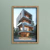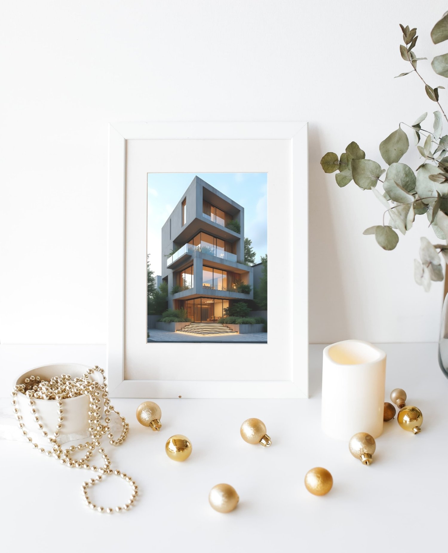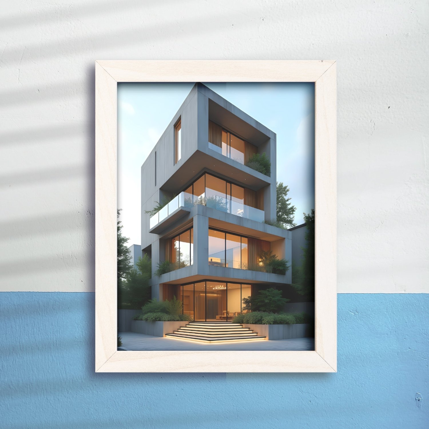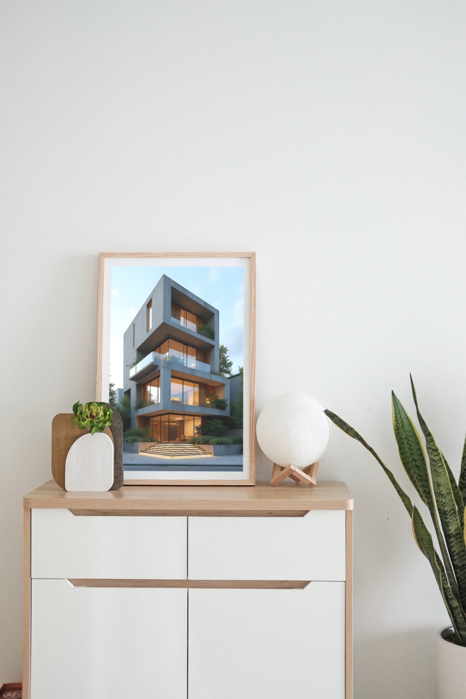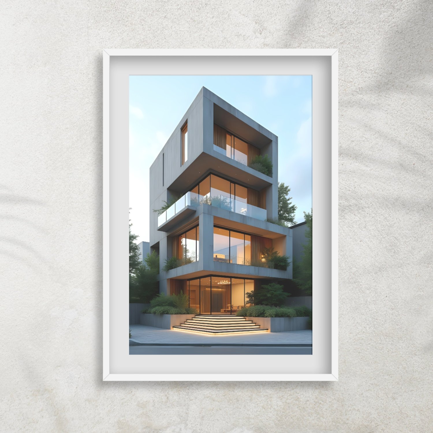 This striking printable wall art showcases a modern concrete house with clean lines, geometric shapes, and large windows. The design embodies minimalist architectural principles, creating a sense of spaciousness and tranquility. The image captures the beauty of contemporary residential design and is perfect for adding a touch of modern elegance to any home or office. This is a printable digital download; simply download, print, and frame. This image was created using AI as a visualization tool.