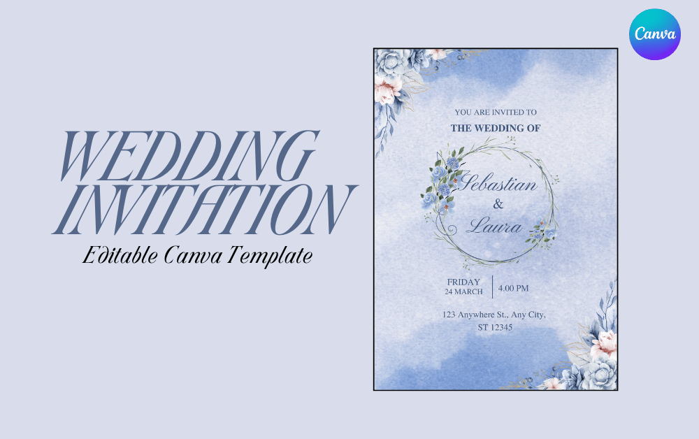 Soft Blue and Floral Wedding Invitation – Editable Canva Template