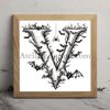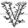 The letter V coloring book halloween occupying 90% of a 1024x1024 image. Use an Old English font style with clear outlines resembling a coloring book page. The character is composed of intricate bat silhouettes, creating a spooky Halloween atmosphere. Use only pure black (#000000) for the character and outlines, and white for the background.2D, black and white style resembling a high-quality adult coloring book page.