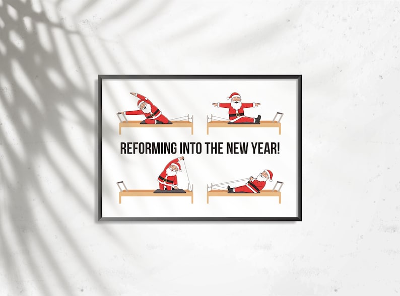 Bring holiday cheer into your Pilates studio, gym, or home with this funny Christmas Pilates poster featuring Santa Claus doing reformer exercises! 🎅✨ Perfect for instructors, Pilates lovers, or anyone who wants to celebrate the season with a playful, fitness-inspired twist.