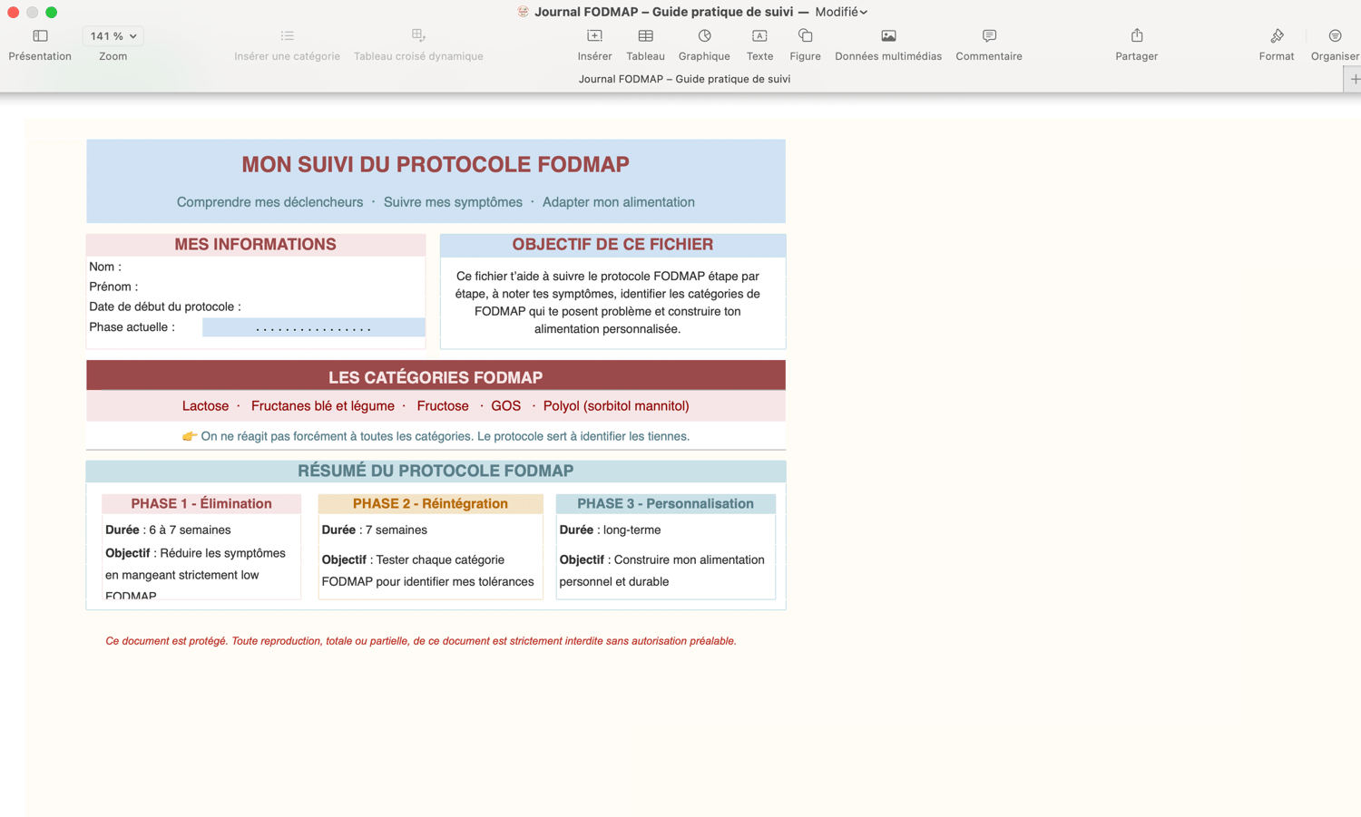 - Suivez facilement chaque étape du protocole Low FODMAP en remplissant simplement les cases.