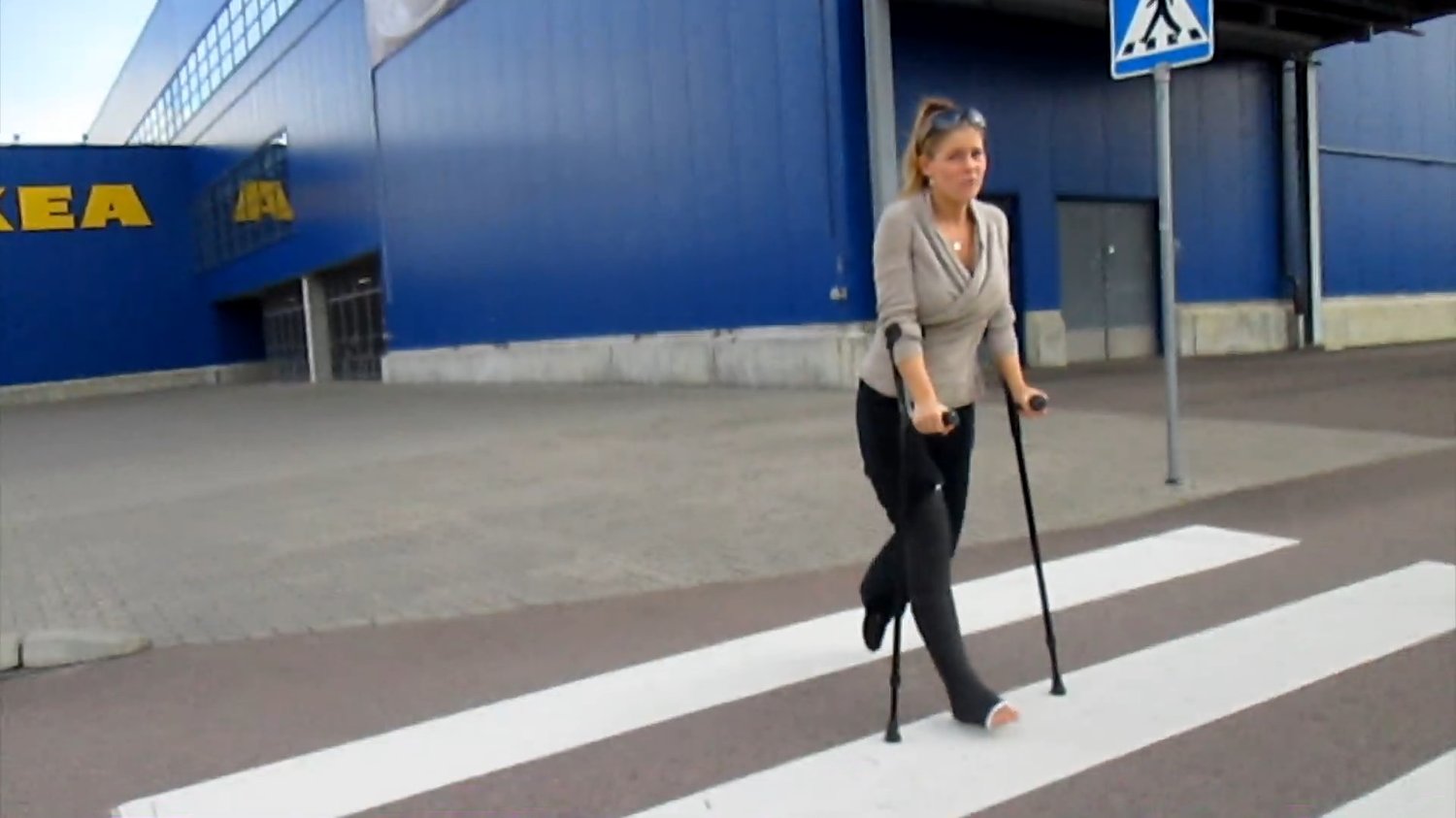 Ice crutch with her black LLC in for a short visit at IKEA. We follow her around in the store but she quickly gets tired today and decides to get back to the car.However, she manages to sit down and rest and show us her long leg cast before she is back at the car.