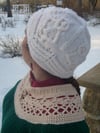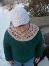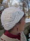 The hat is knit in the round from the brim up. It features continuous cables in the style developed by Elsebeth Lavold.