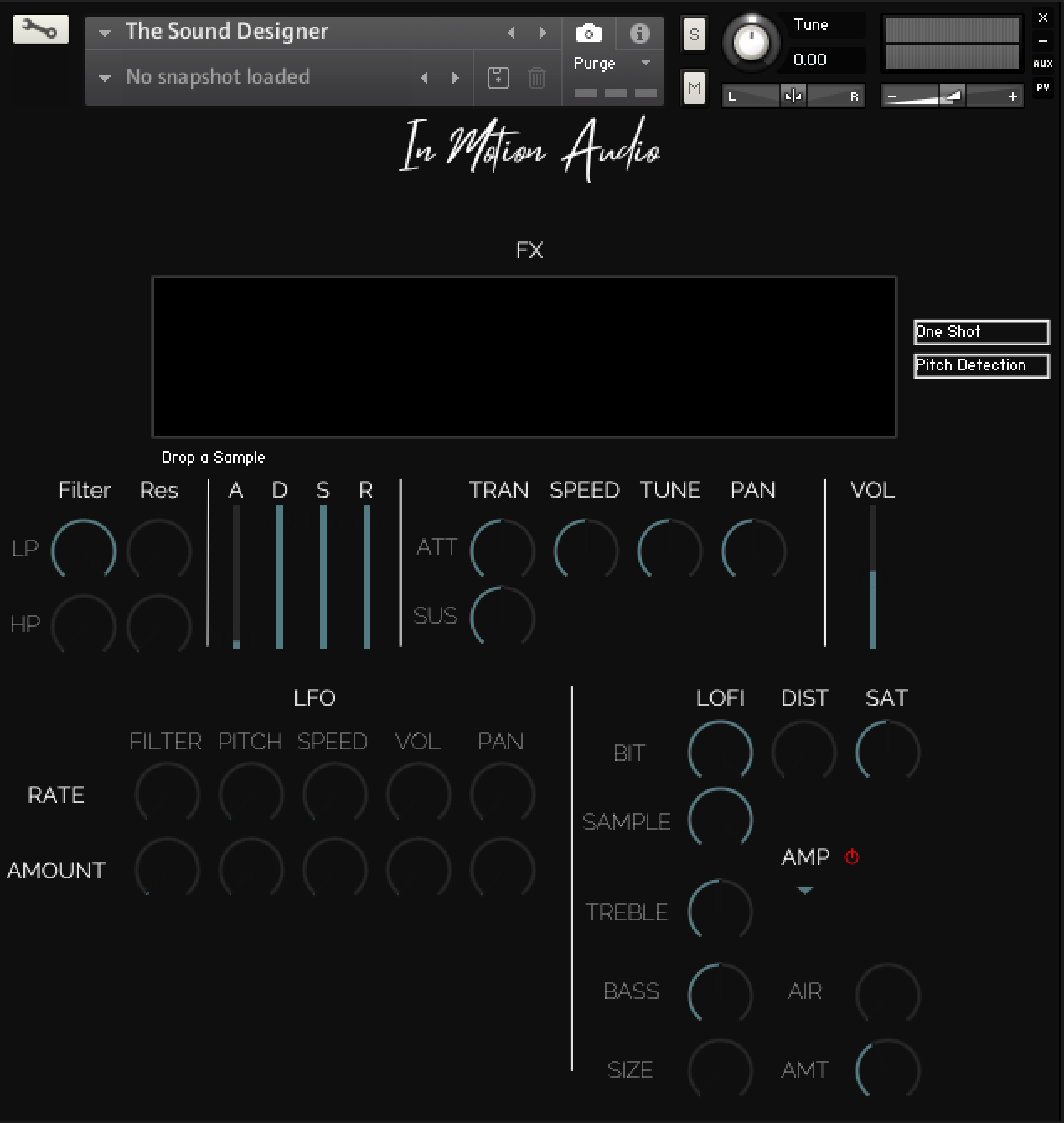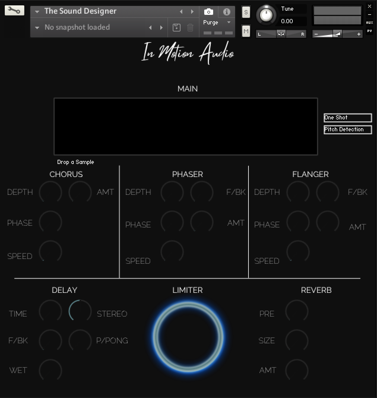 The Sound Designer allows you to drag and drop any audio on to the GUI, The Sound Designer automatically detects the Pitch and then maps the sample to the entire keyboard giving you different pitches of that said sample, you can then use that sample as a one shot or loop it. The Sound Desinger is also set up in Time Machine Pro keeping all your samples at the same speed no matter where you press on the keyboard.