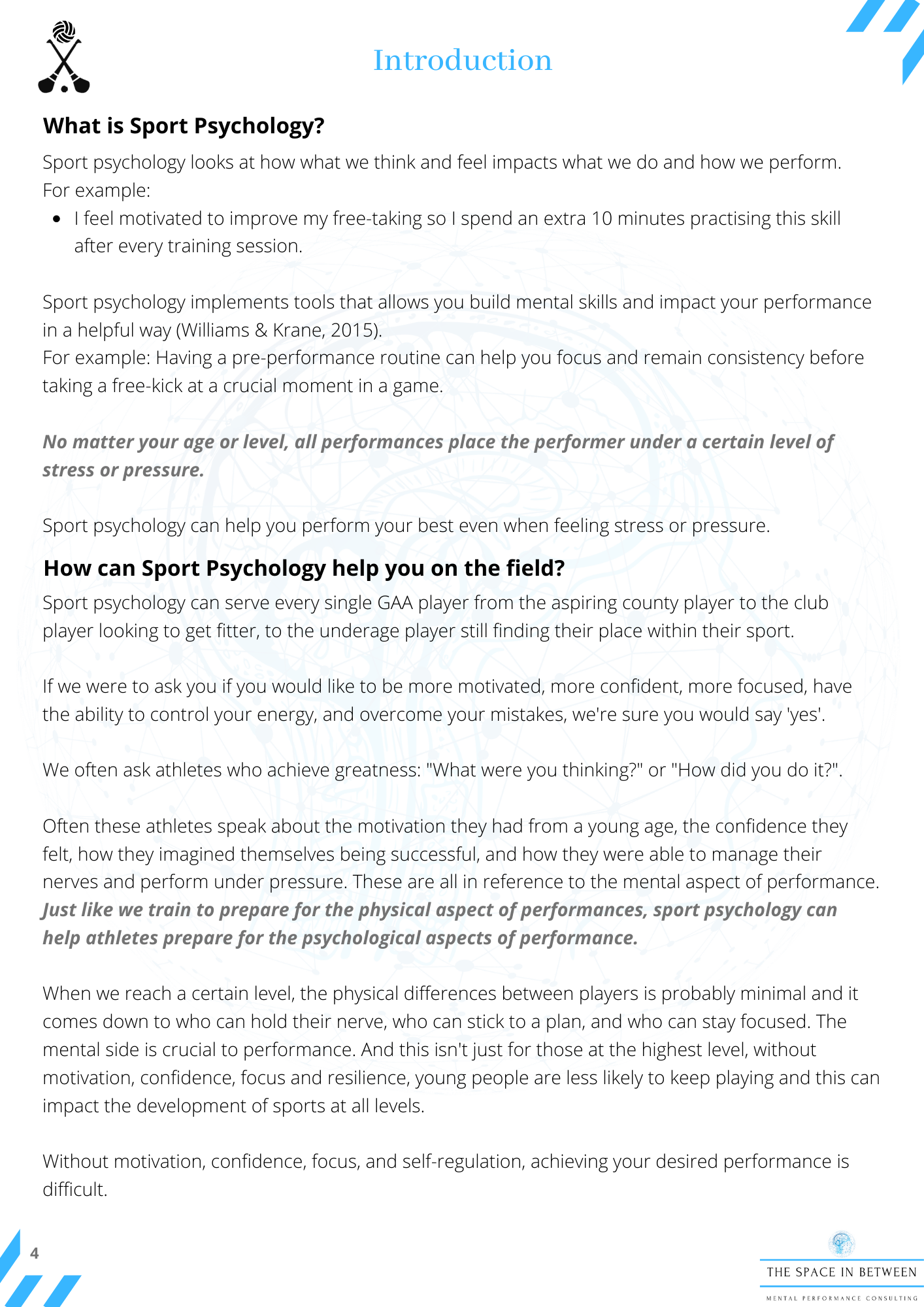 The purpose of this resource is to aid GAA Player's in developing the psychological aspect of their performance on and off the field.