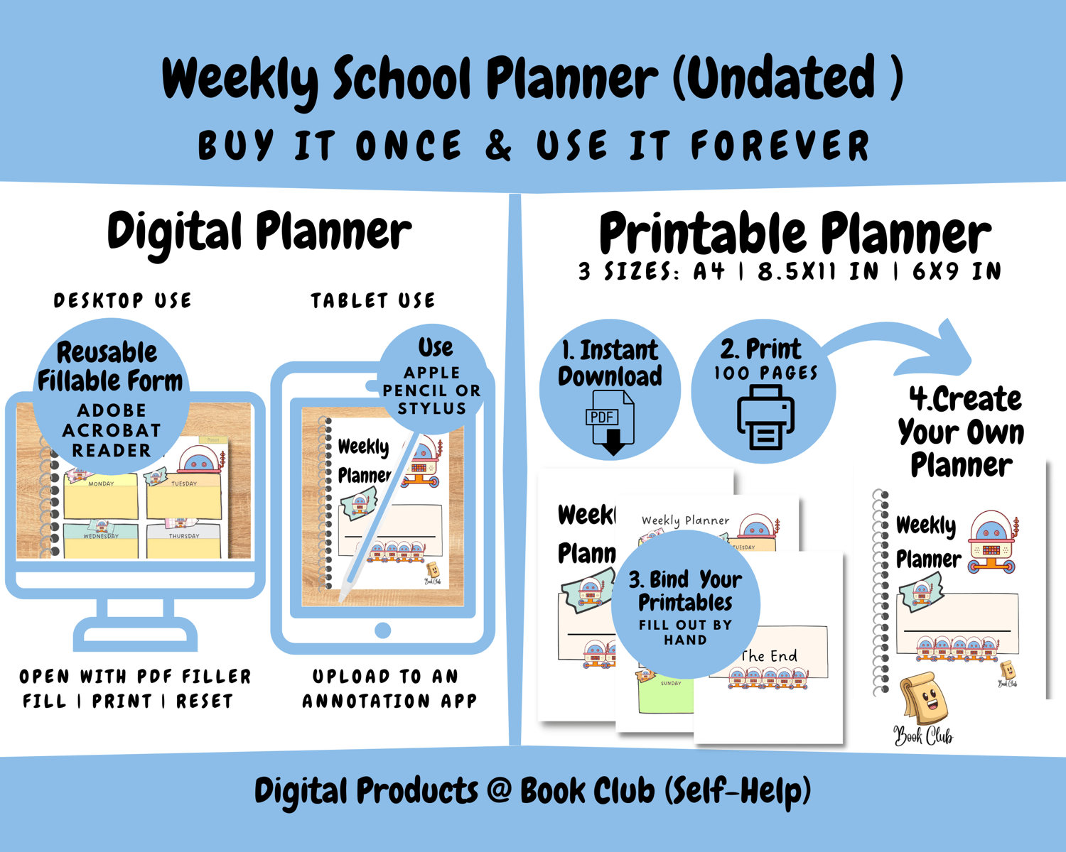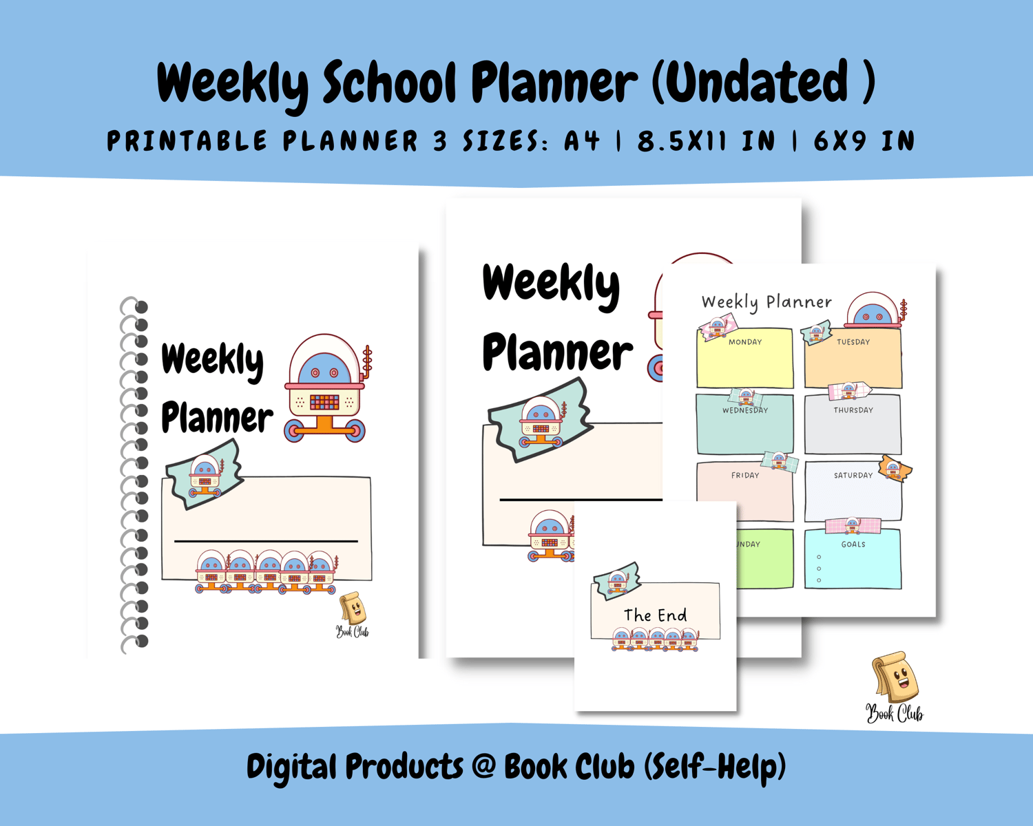 Is your child fascinated by robots and outer space? This vibrant Space Robot Weekly School Planner featuring a retro robot in blue, yellow, orange, and peach colors is designed to capture young imaginations while helping them stay organized and motivated!