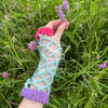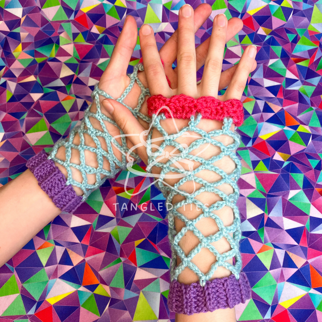 A pair of crochet fishnet fingerless mitts. Light-weight, soft, and comfortable.